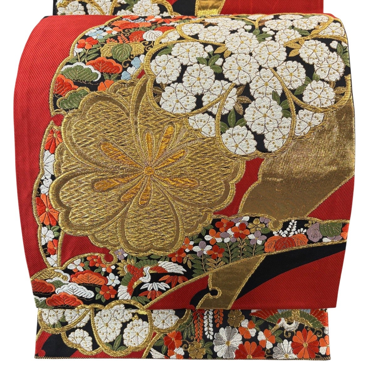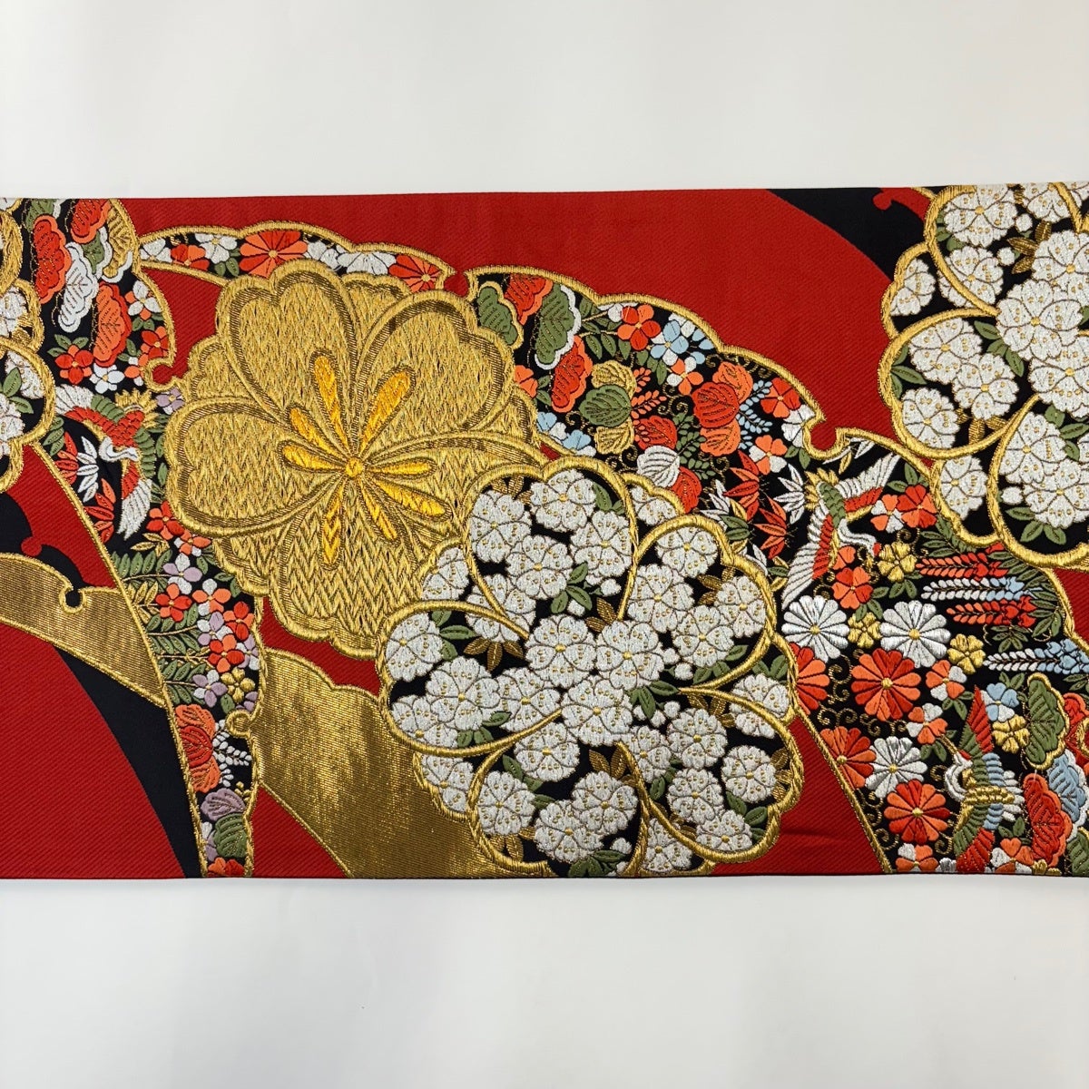 【美品】 袋帯 秀品 桜 花鳥 金銀糸 箔 赤 六通 正絹