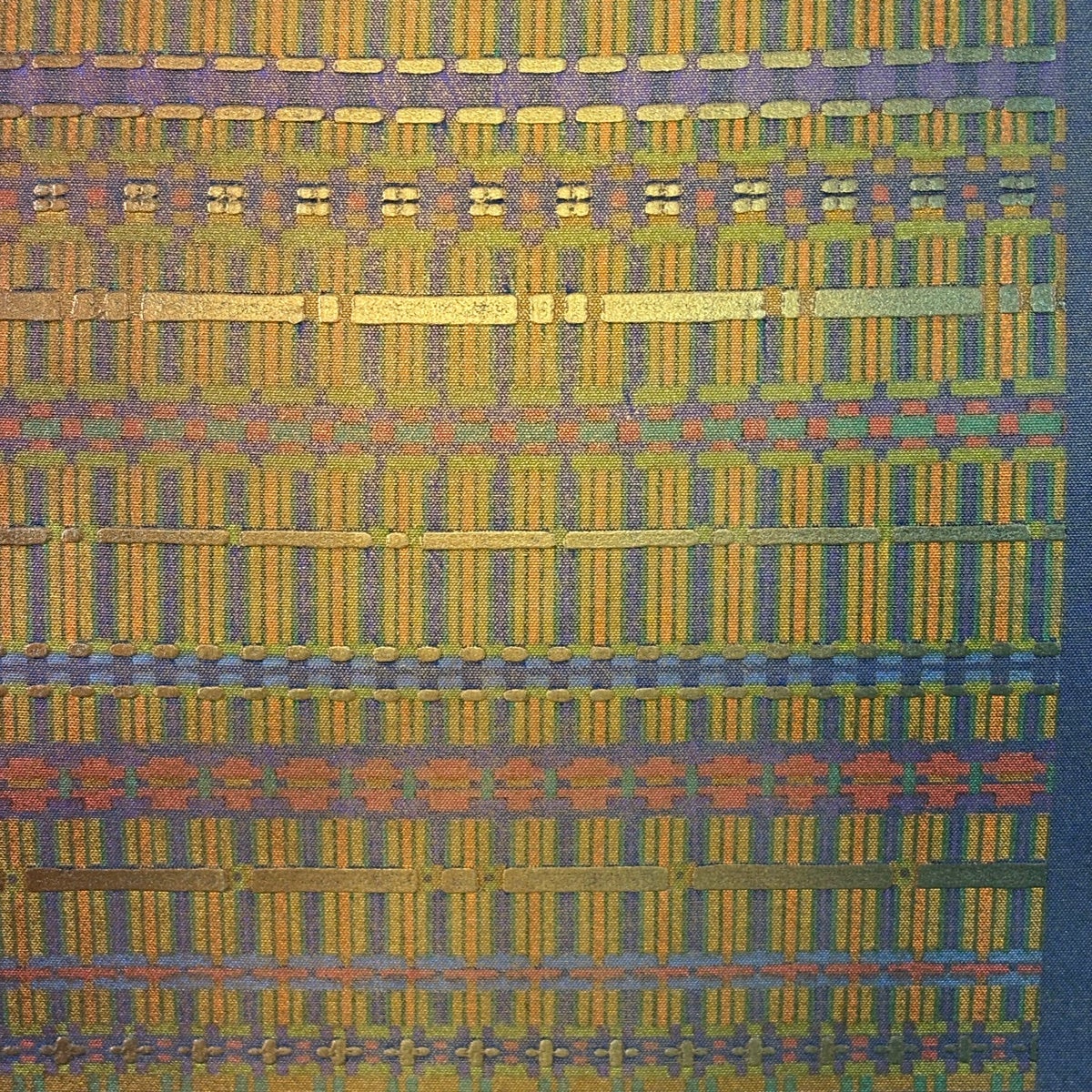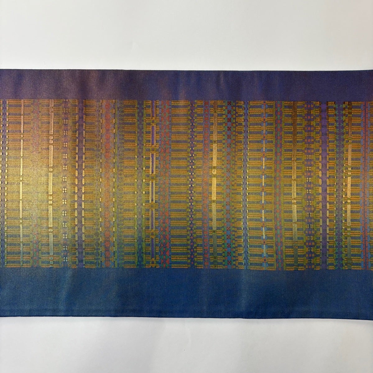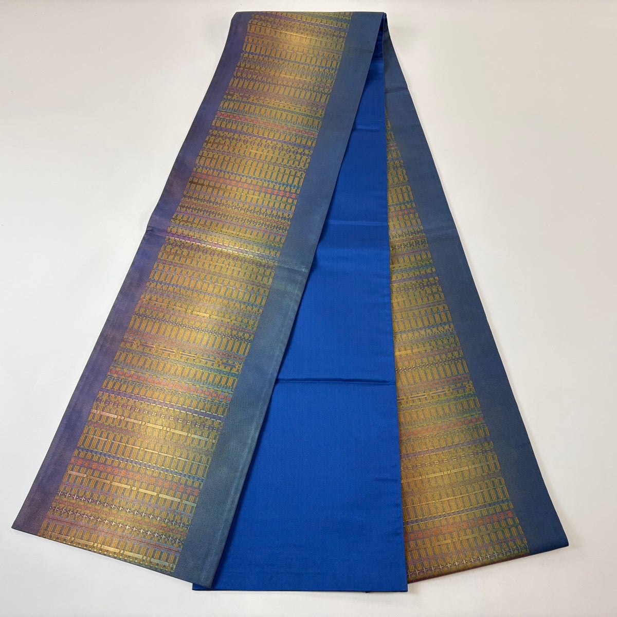 【美品】 袋帯 秀品 幾何学模様 縞 金彩 ぼかし 青 全通 正絹