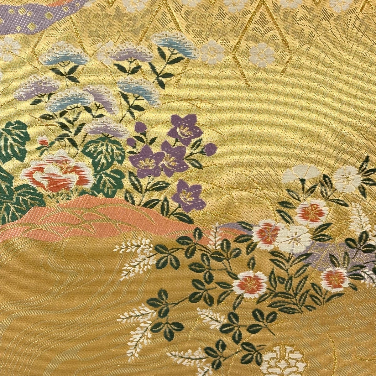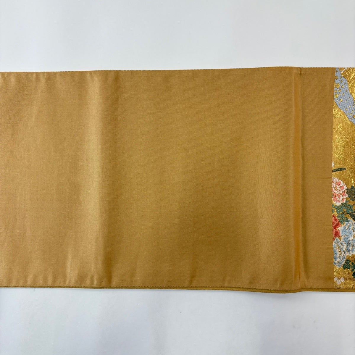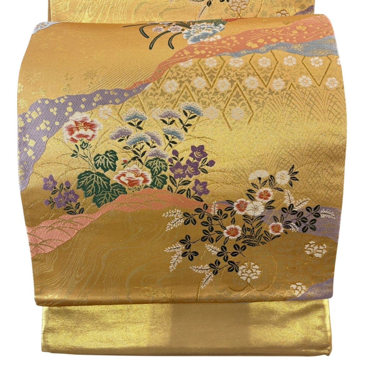 【美品】 袋帯 秀品 証紙あり 草花 波 唐織 箔 金色 六通 正絹
