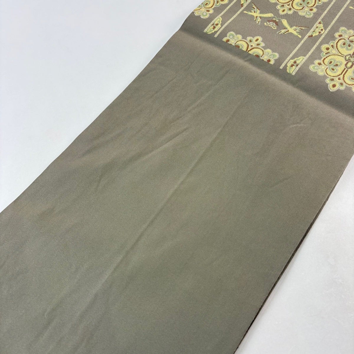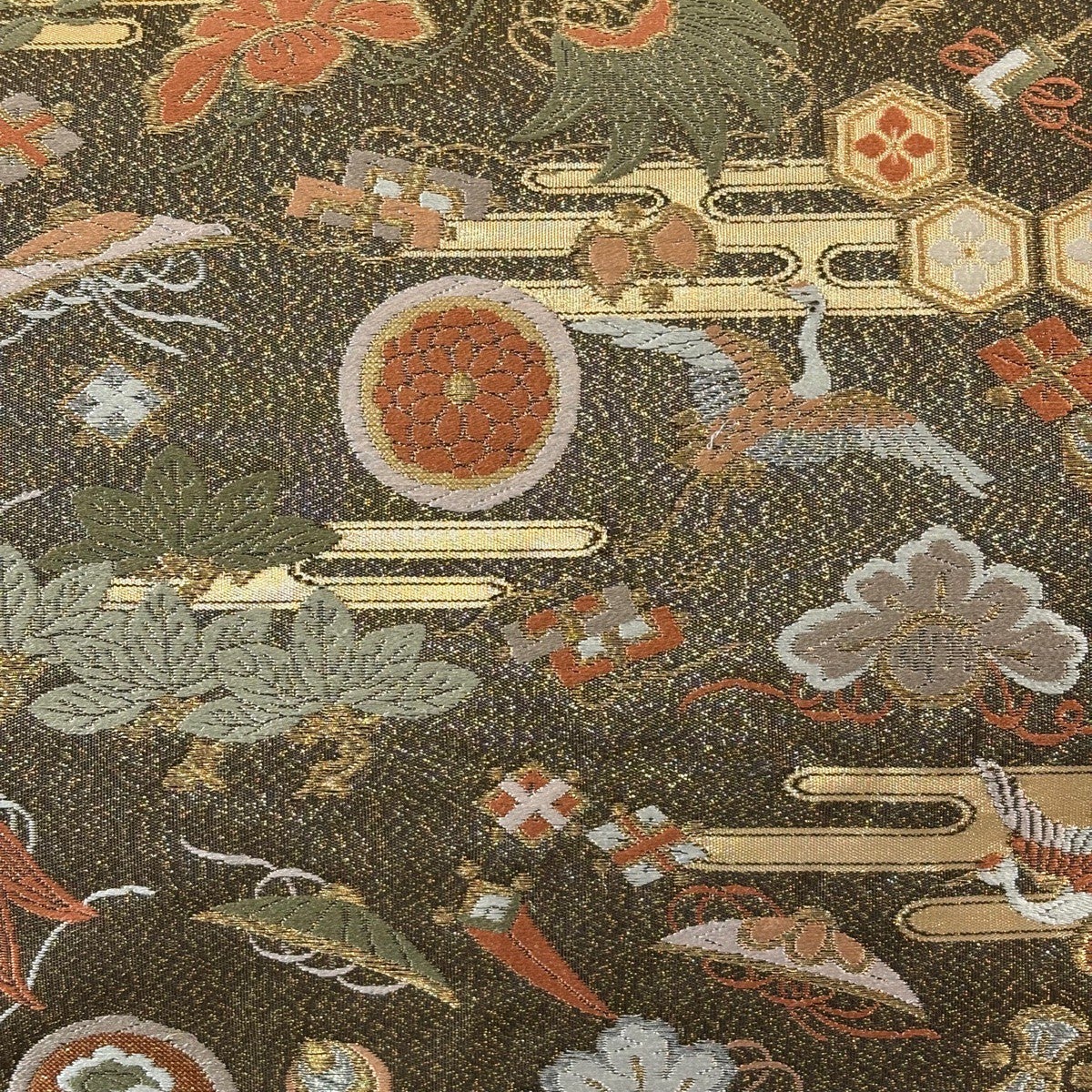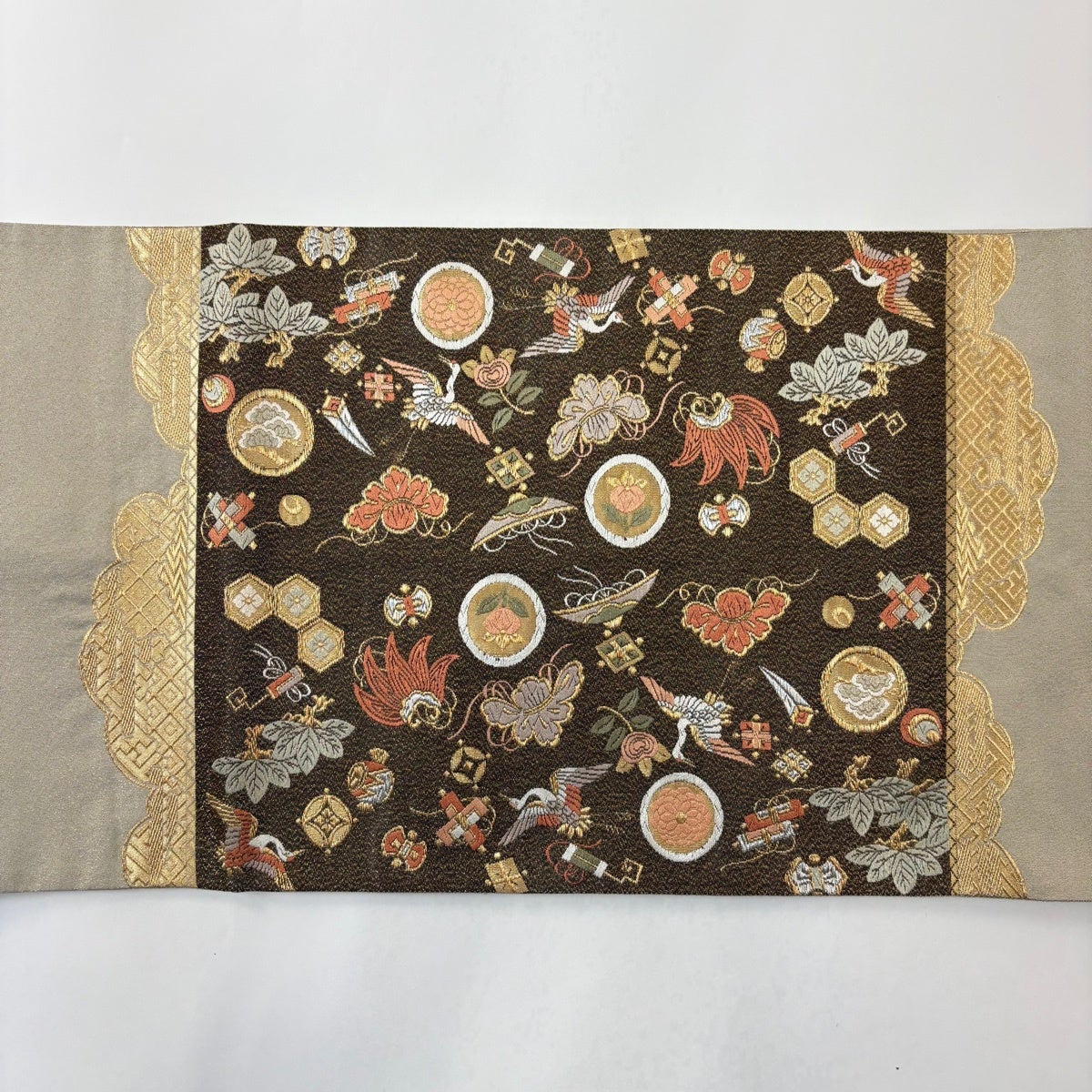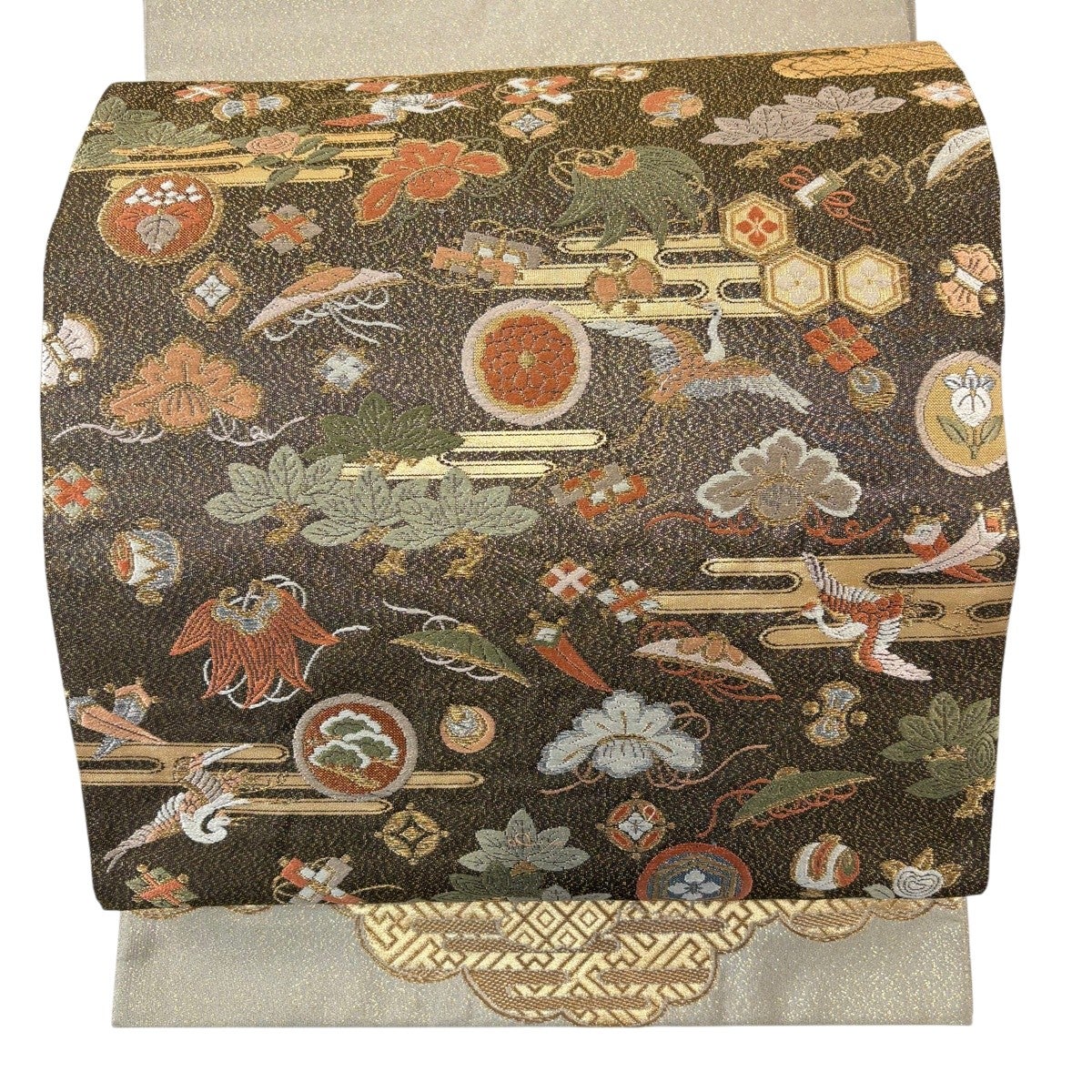 【美品】 袋帯 秀品 宝尽くし 鶴 唐織 箔 灰茶 お太鼓柄 正絹