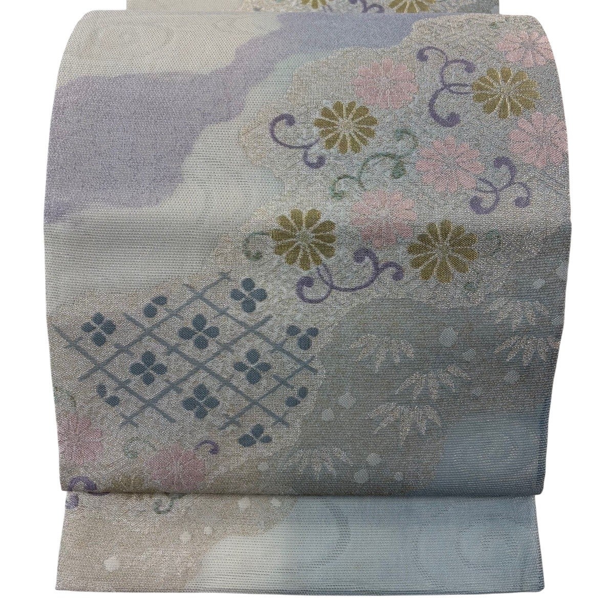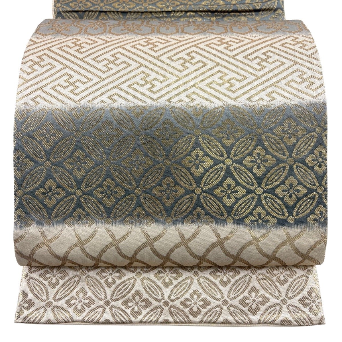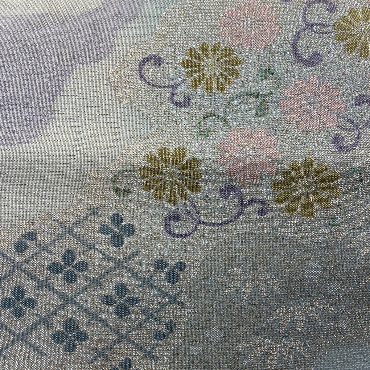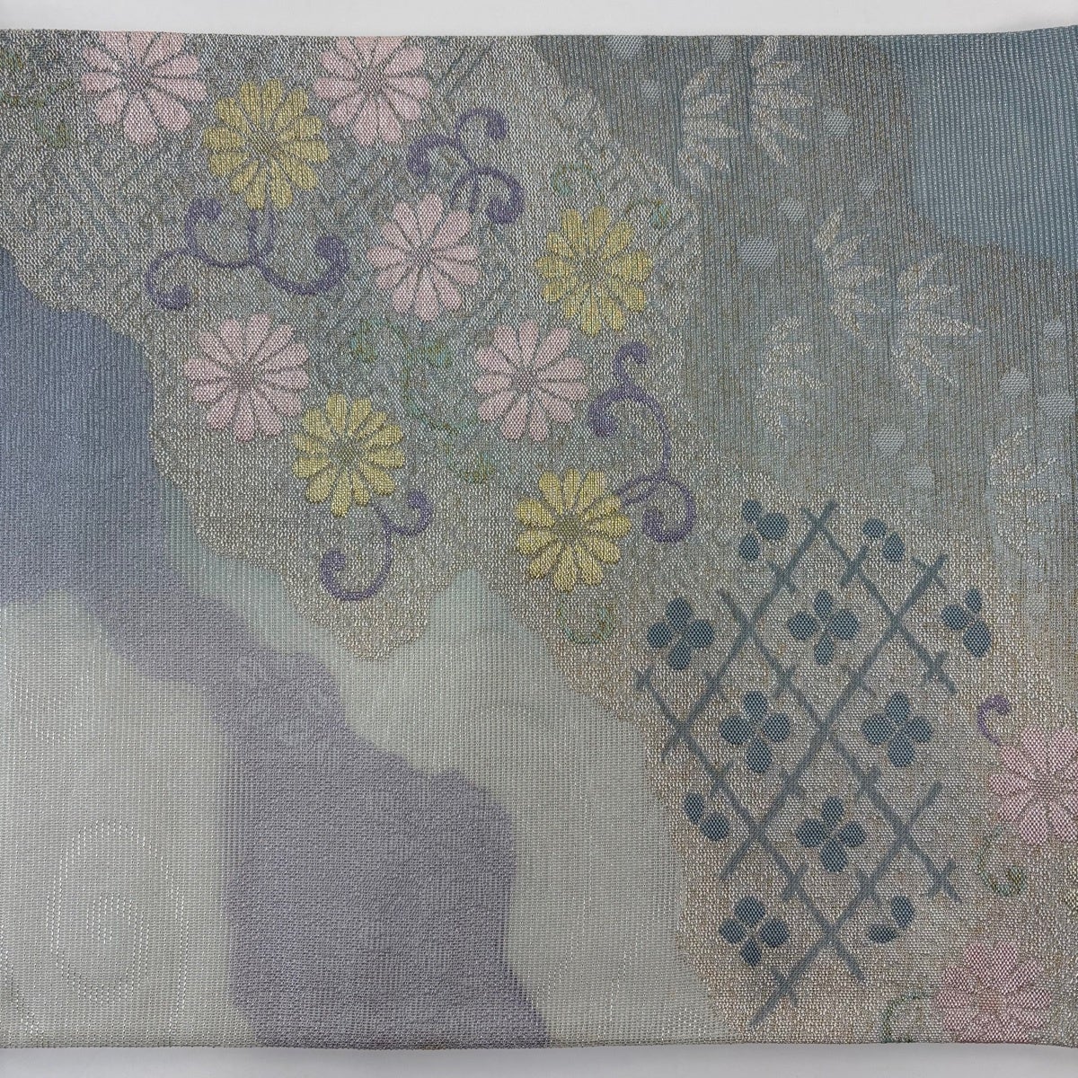 【美品】 袋帯 秀品 夏帯 霞 幾何学模様 箔 金銀糸 青灰色 六通 正絹