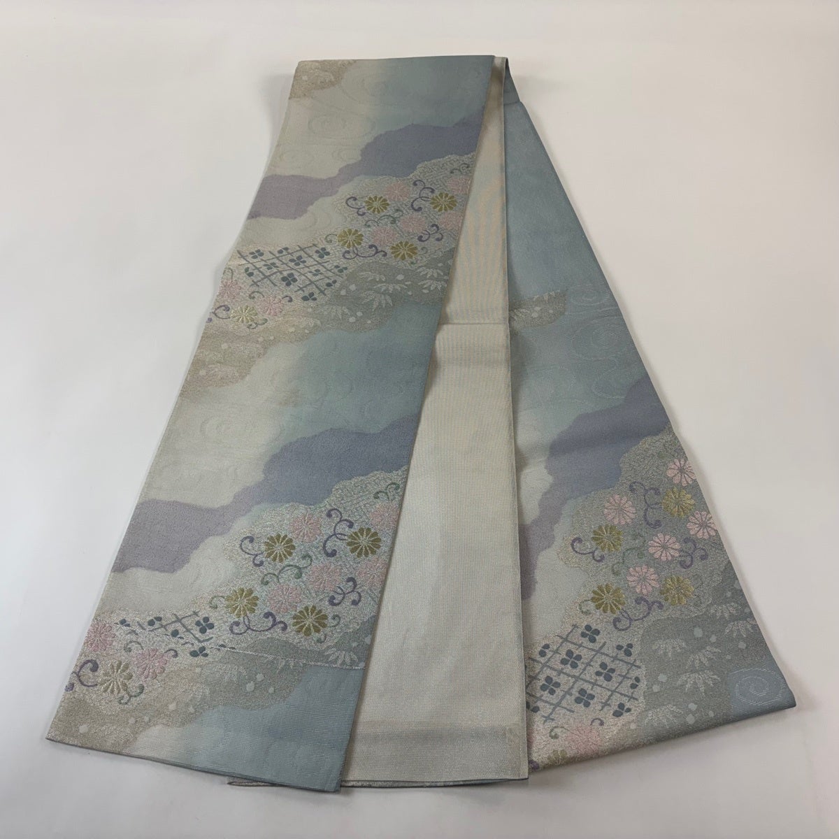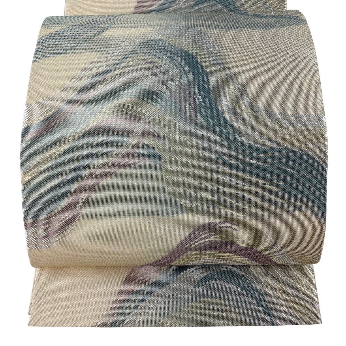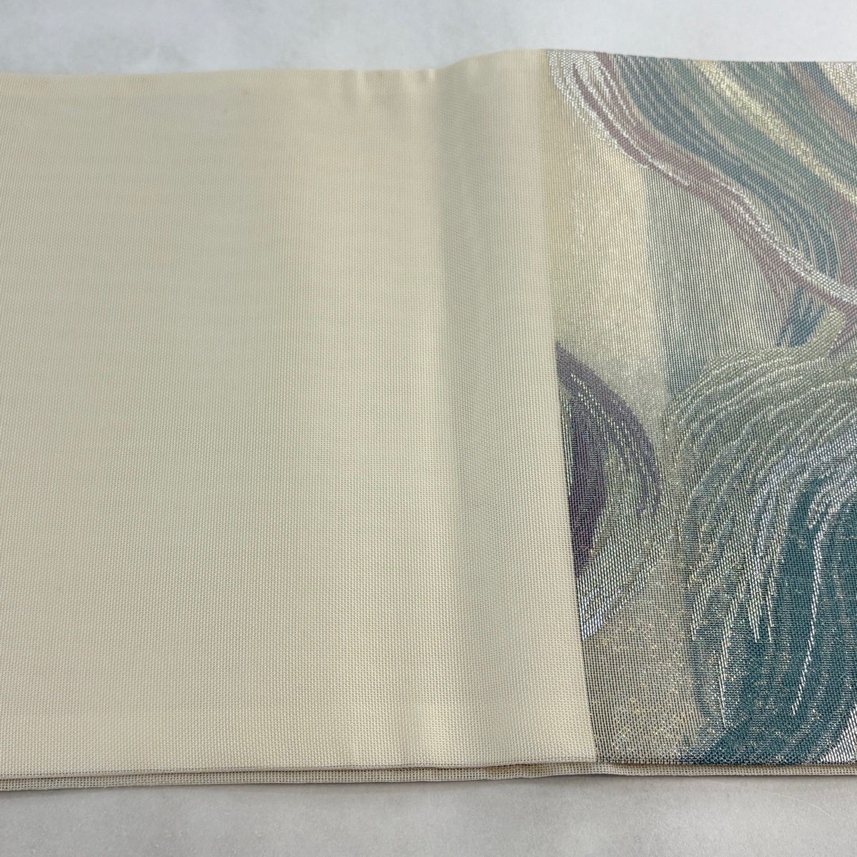 【美品】 袋帯 秀品 夏帯 霞 幾何学模様 箔 金銀糸 青灰色 六通 正絹
