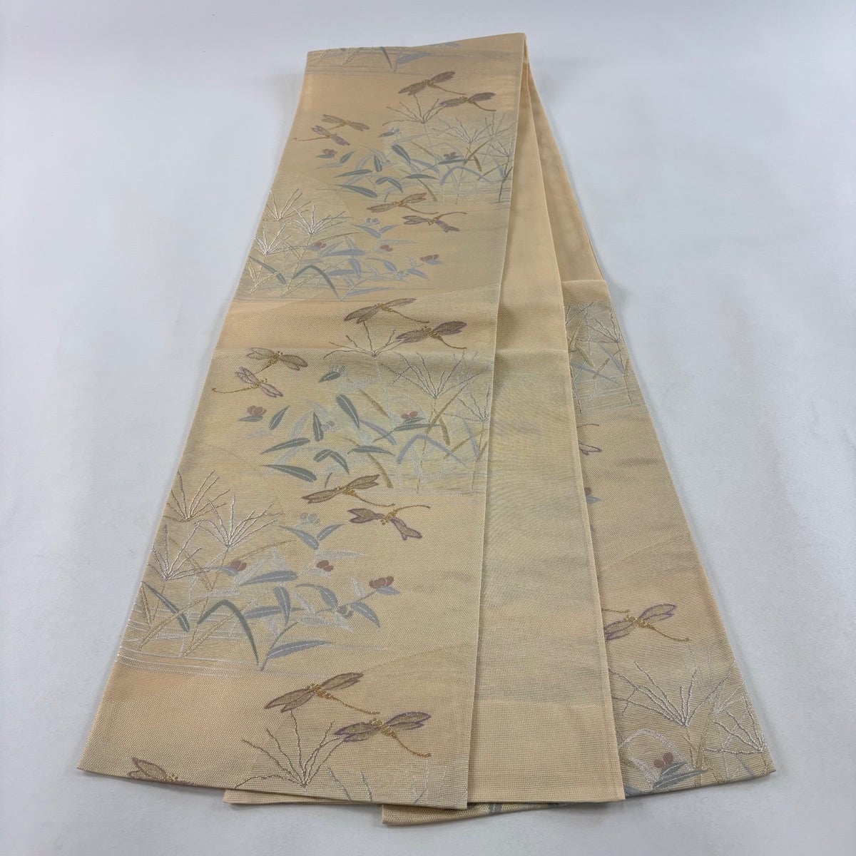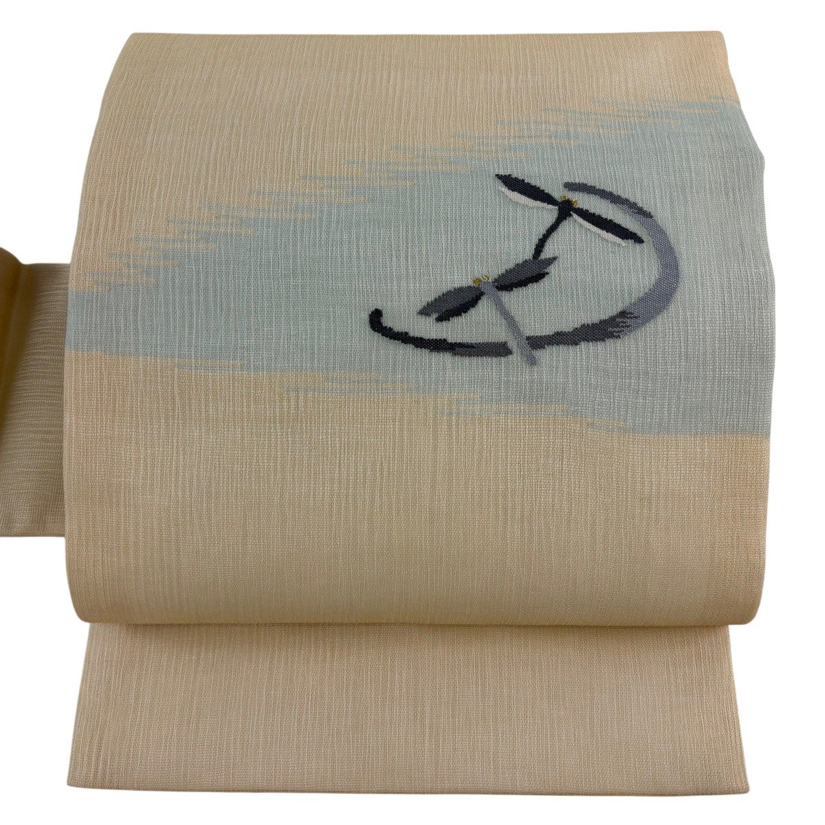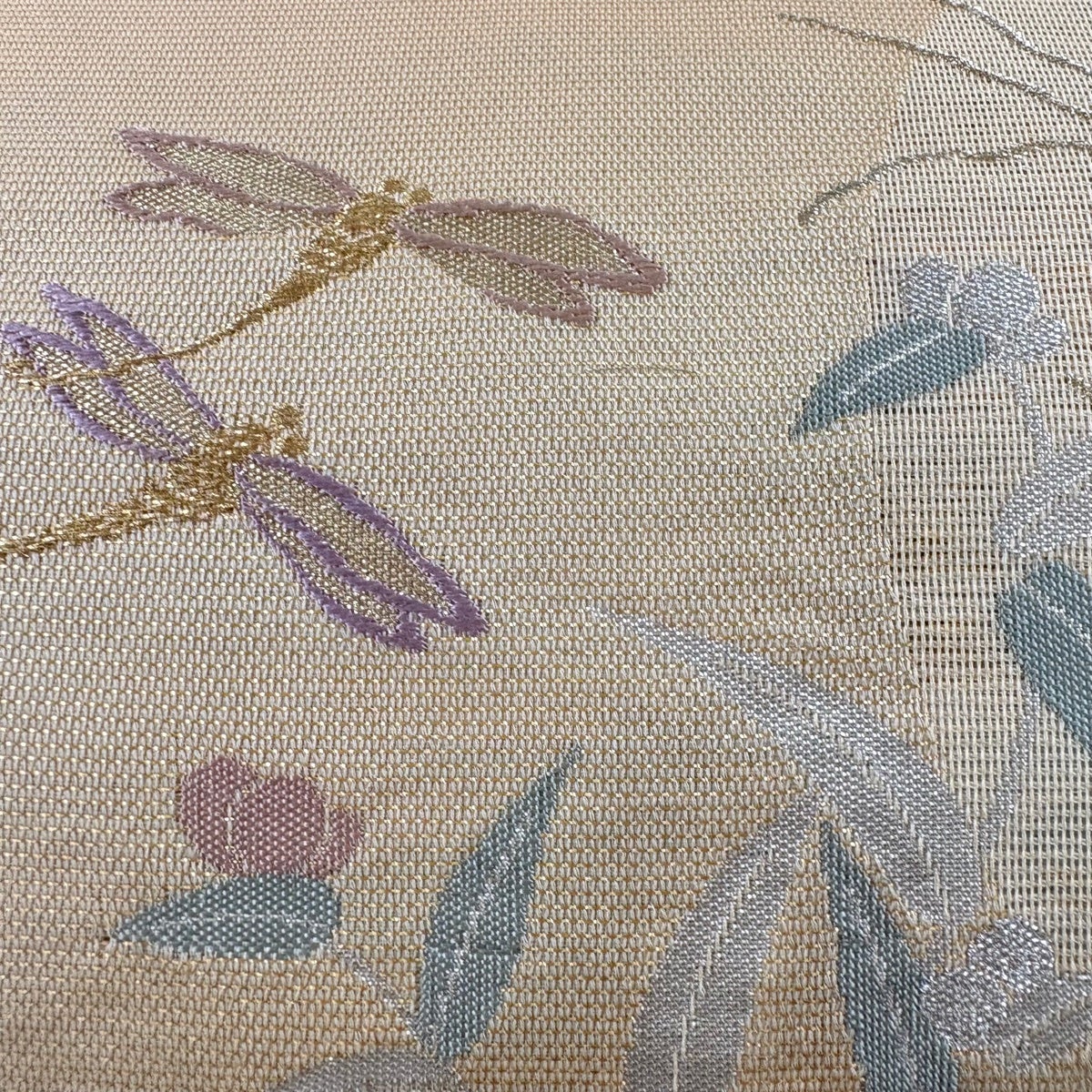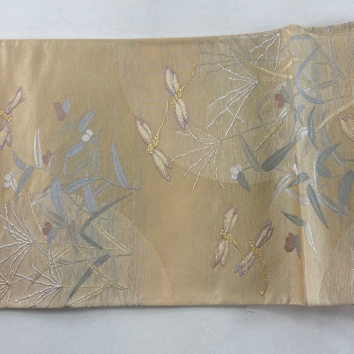 【美品】 名古屋帯 秀品 夏帯 トンボ 霞 金糸 ベージュ 正絹