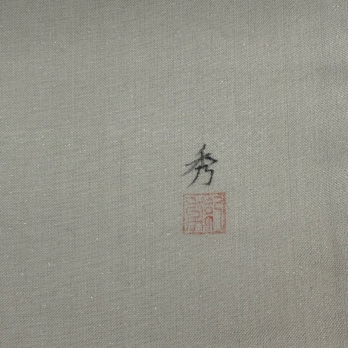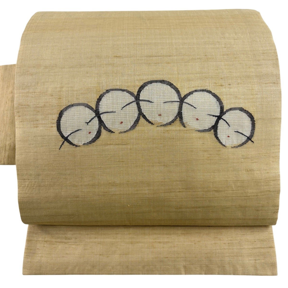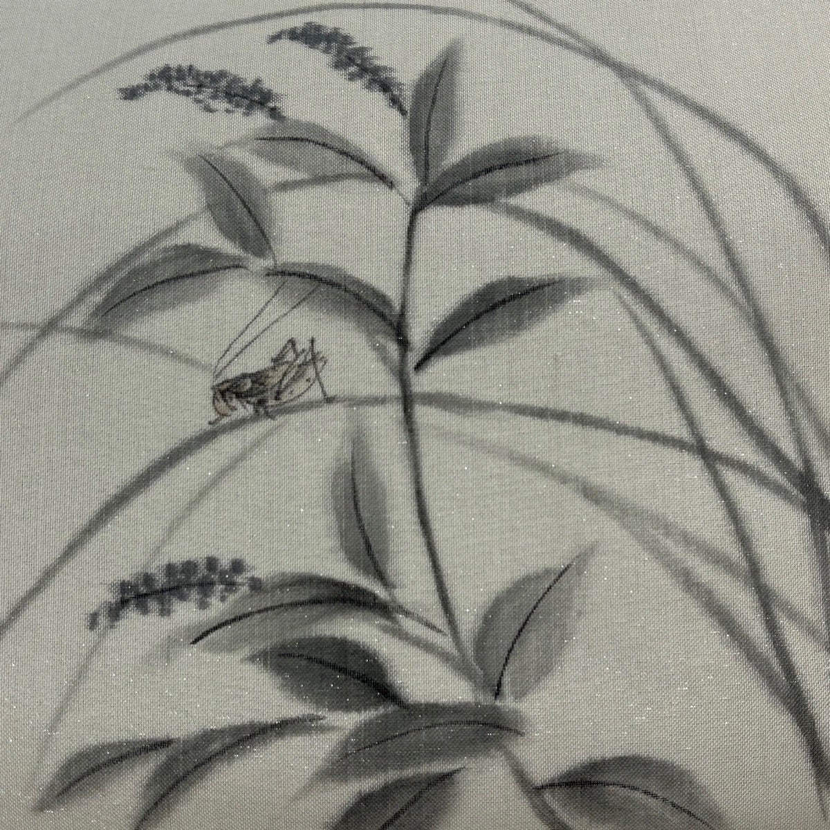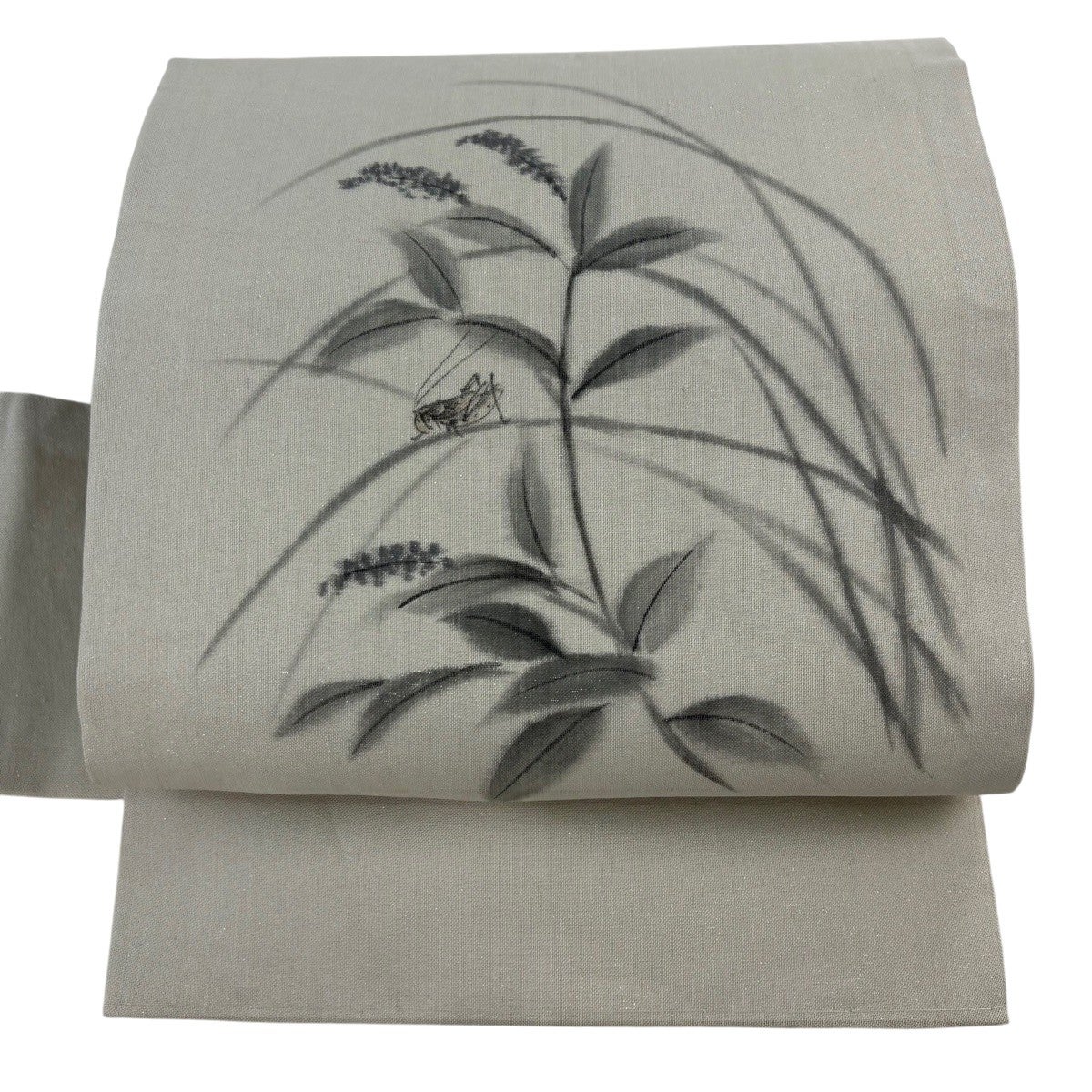 名古屋帯 秀品 落款あり 夏帯 草花 コオロギ 箔 灰色 正絹