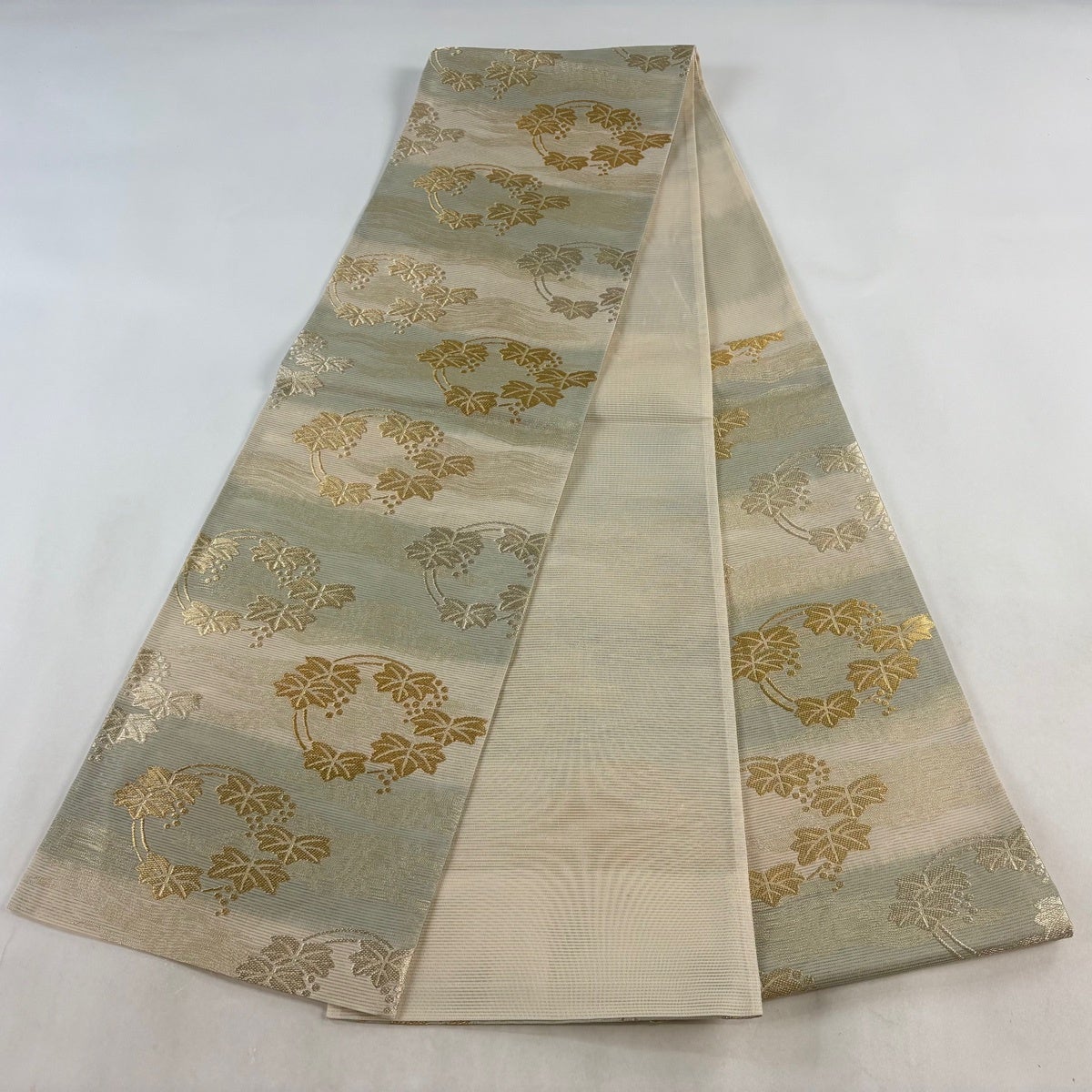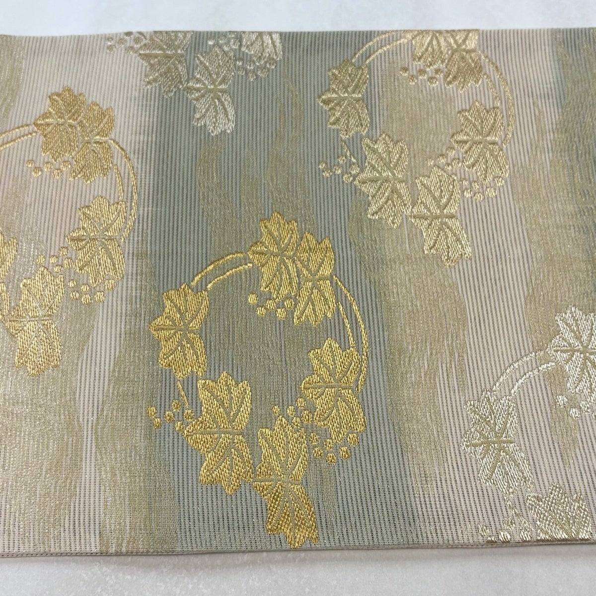 【美品】 袋帯 秀品 夏帯 絽 葉と実 段縞 金糸 箔 ベージュ 六通 正絹