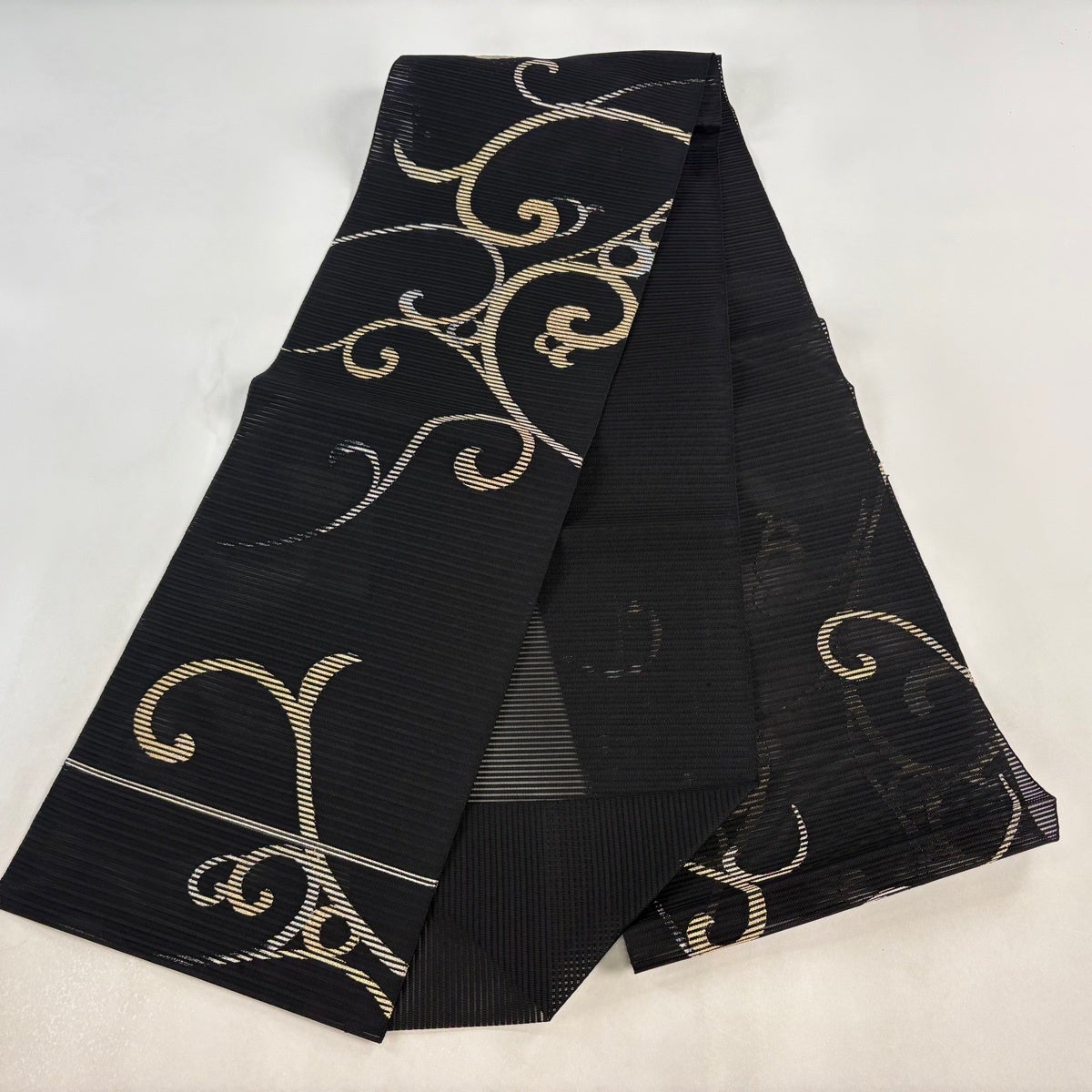 【美品】 名古屋帯 秀品 夏帯 絽 松葉仕立て 八寸名古屋帯 唐草 金銀糸 黒 正絹