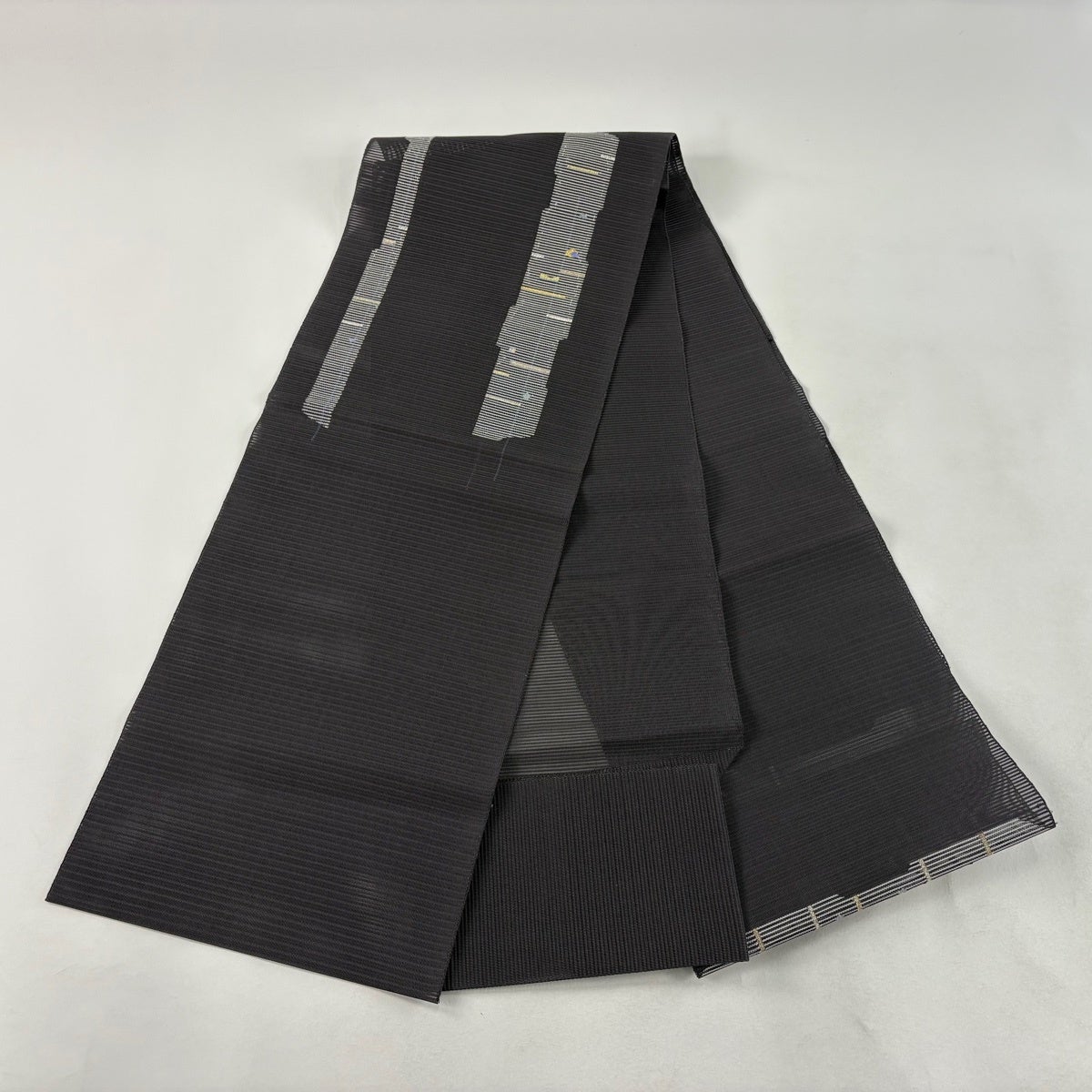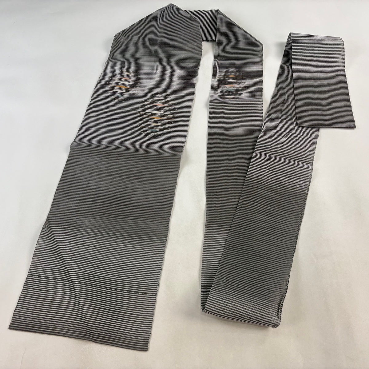 名古屋帯 秀品 夏帯 トンネル仕立て 縞 金銀糸 灰色 正絹