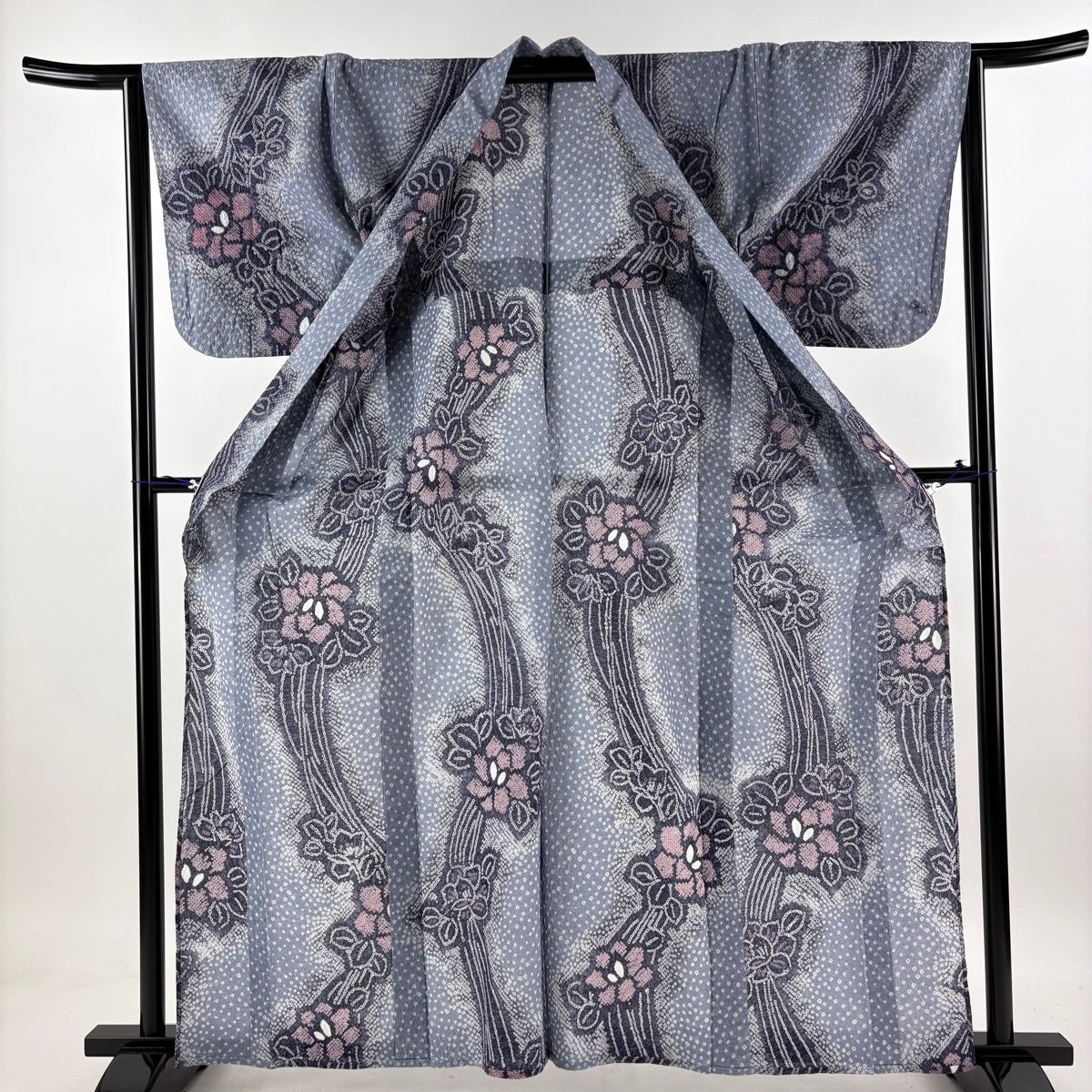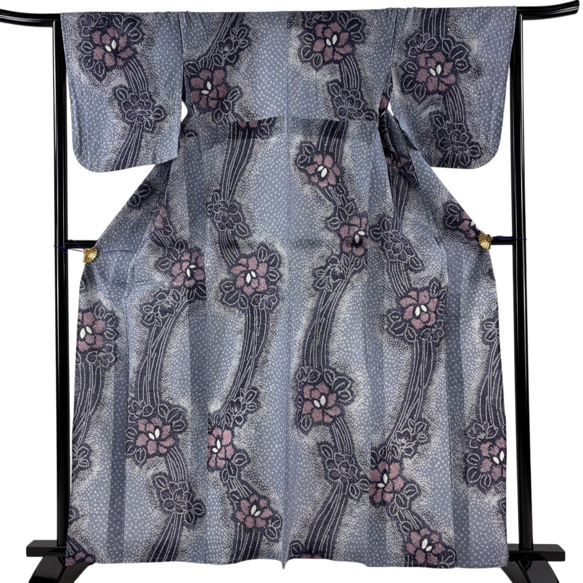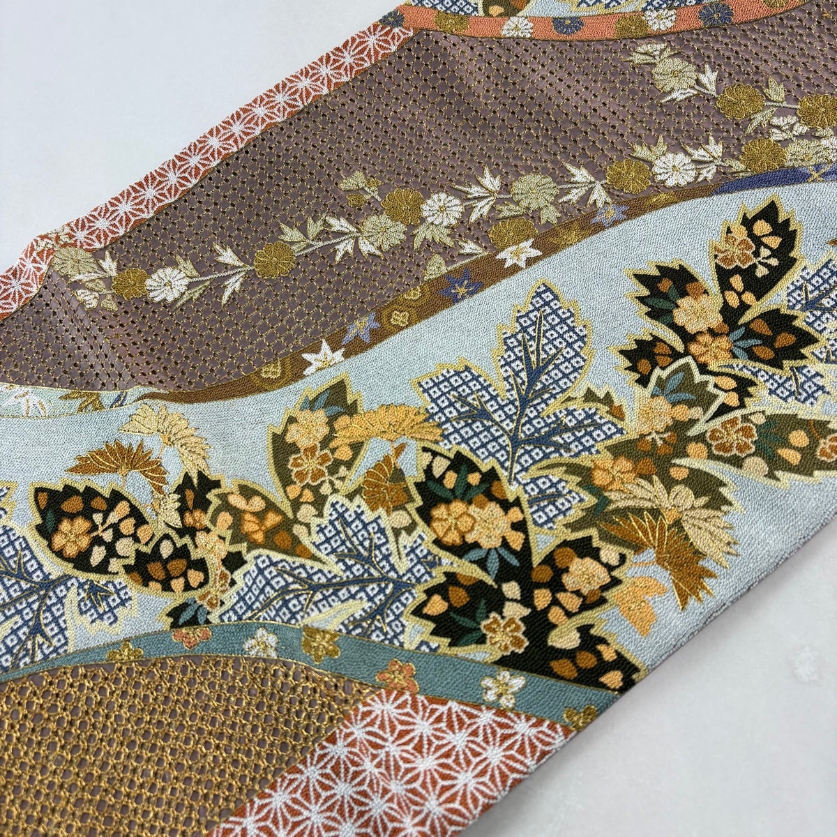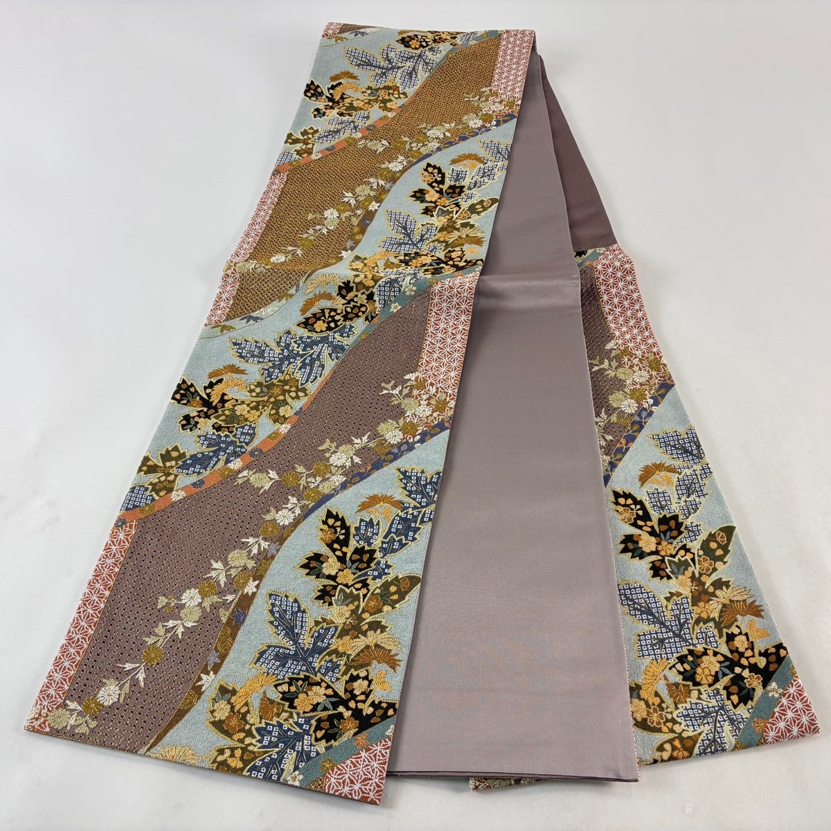 【美品】 袋帯 秀品 紬地 寄せ柄 草花 灰色 全通 正絹