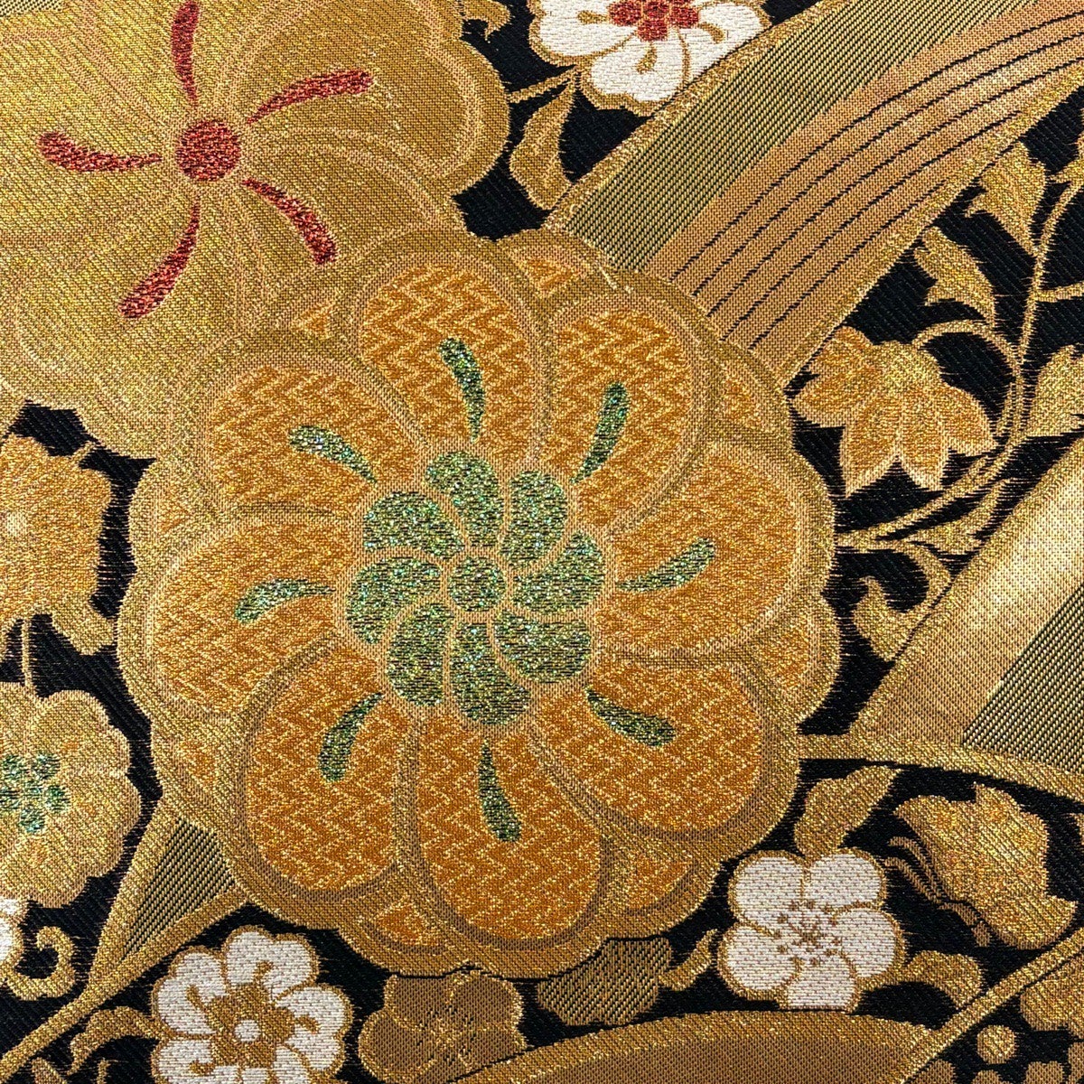 【美品】 袋帯 秀品 落款あり 短冊 雪輪 金糸 唐織 黒 六通 正絹