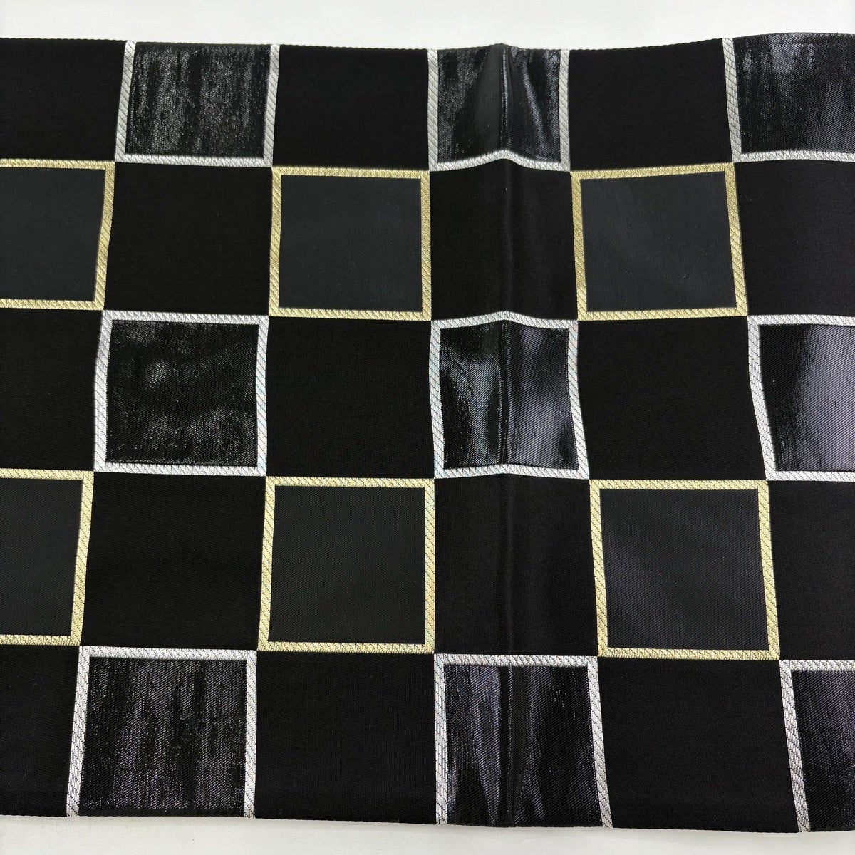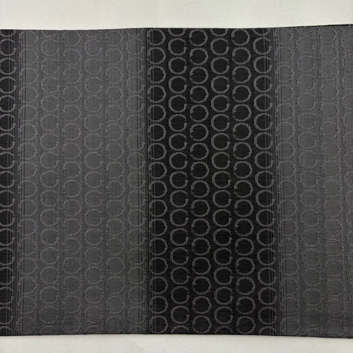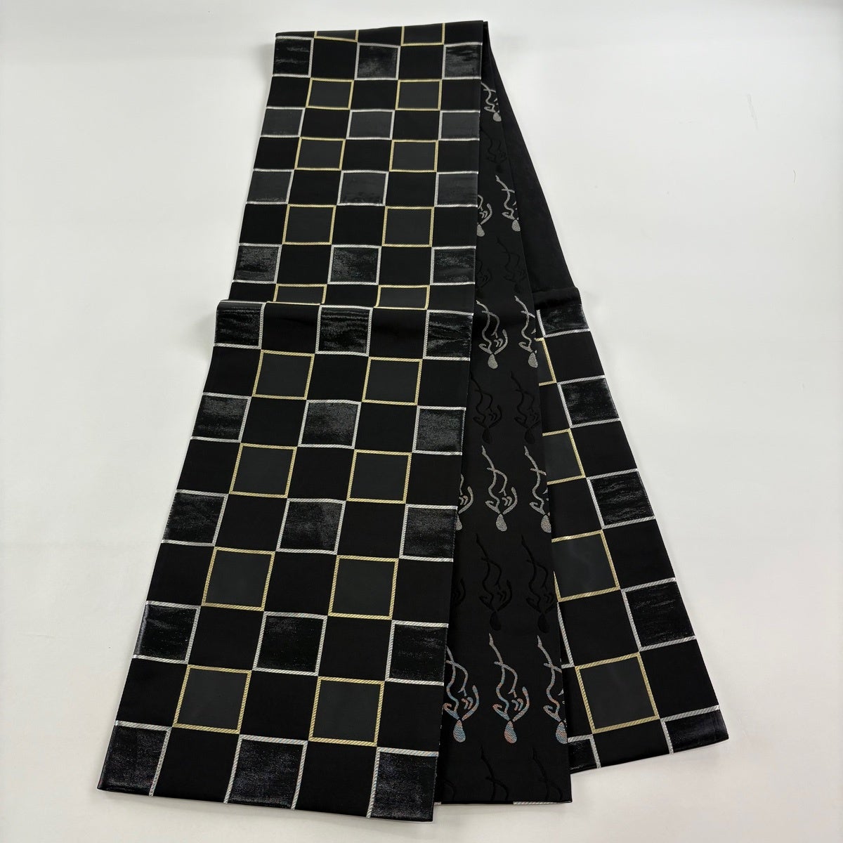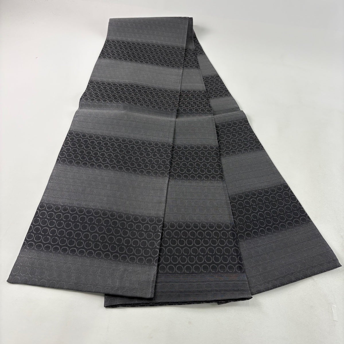 【美品】 袋帯 秀品 段縞 幾何学模様 黒灰 全通 正絹