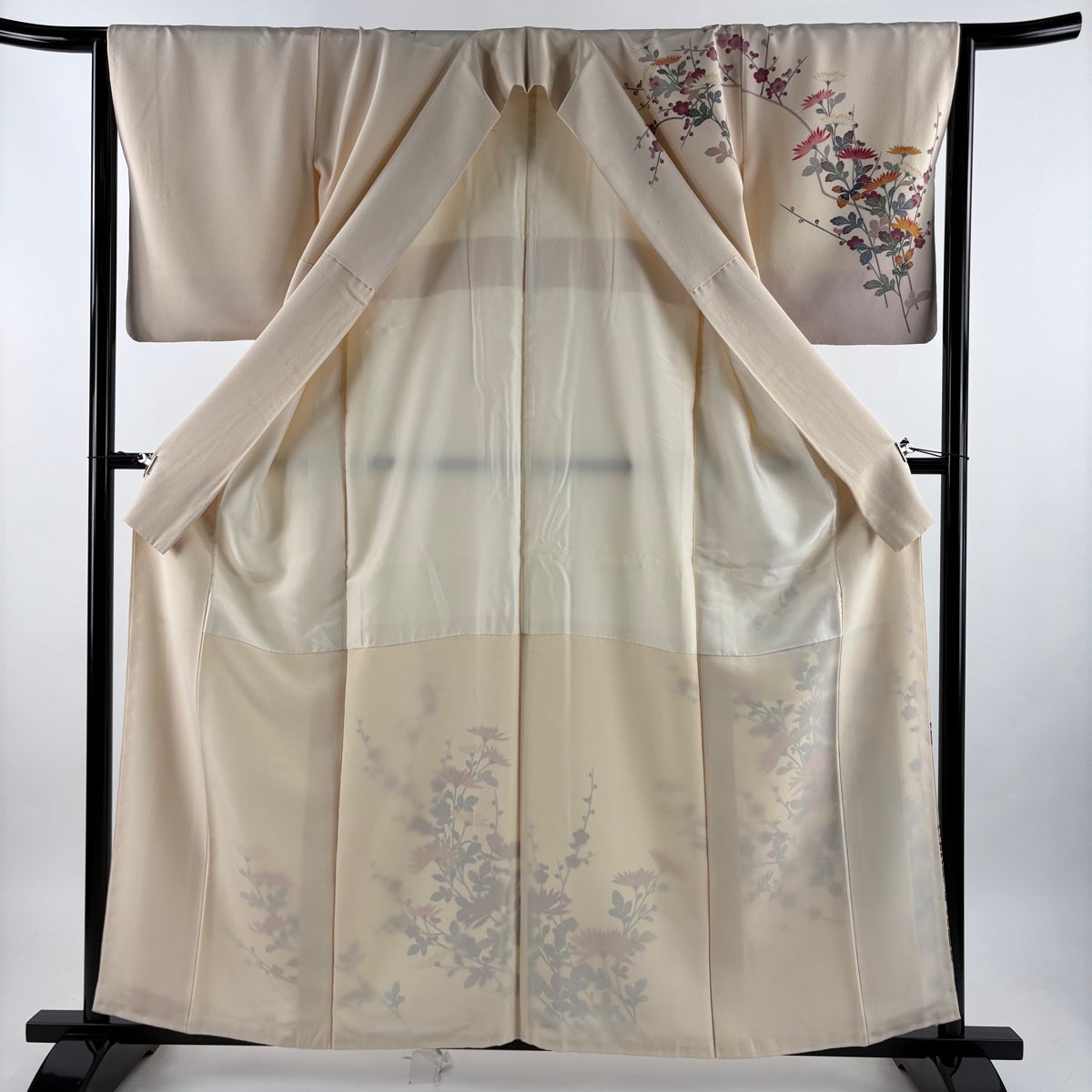 【美品】 紬 身丈159cm 裄丈63cm S 袷 花柄 ベージュ 正絹 秀品