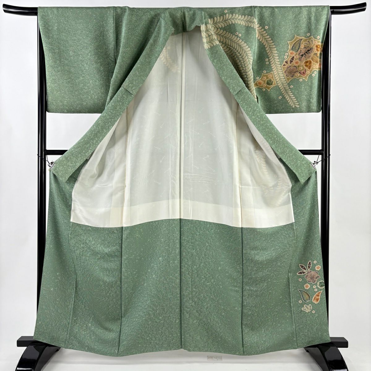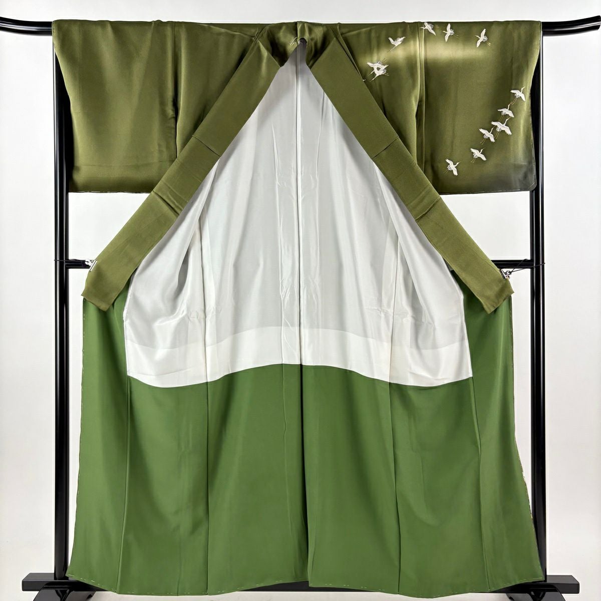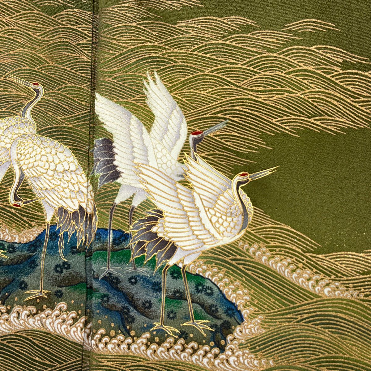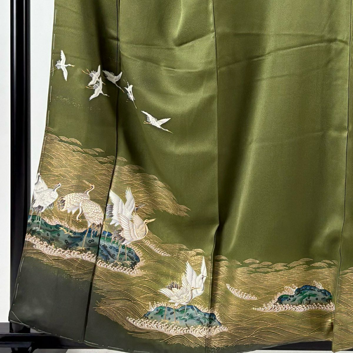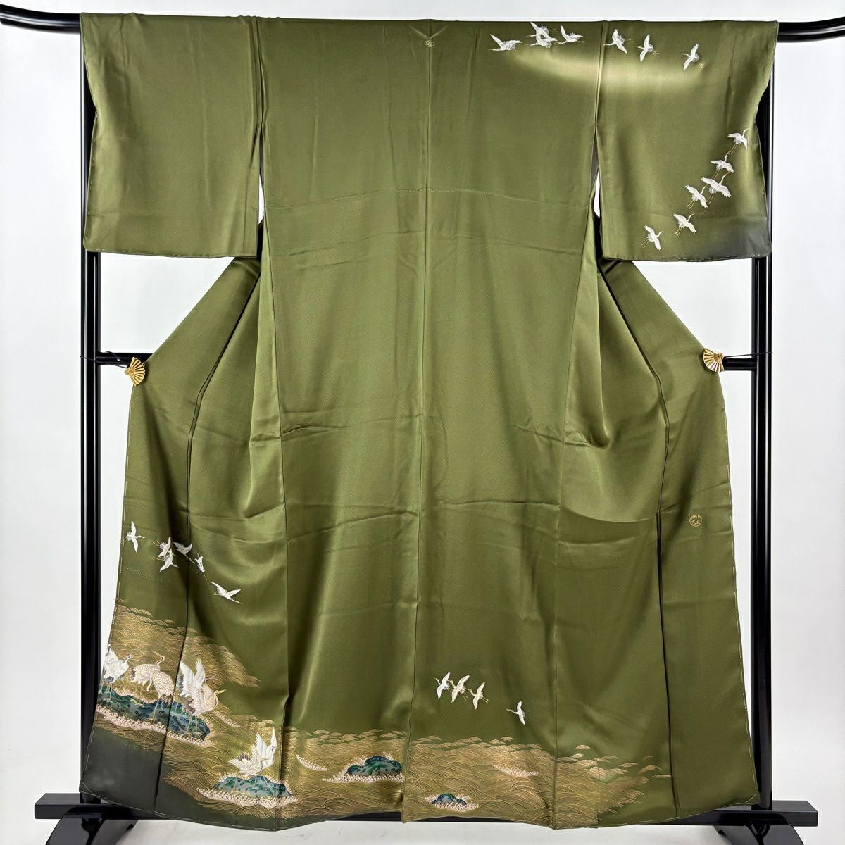 【美品】 訪問着 身丈160cm 裄丈67.5cm L 袷 TOKI志すい 落款あり 鶴 波 金彩 ぼかし 茶緑色 正絹 名品 一つ紋