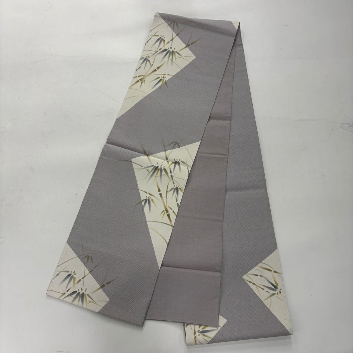 【美品】 名古屋帯 優品 八寸名古屋帯 菊 鴛鴦 箔 金銀糸 灰色 正絹