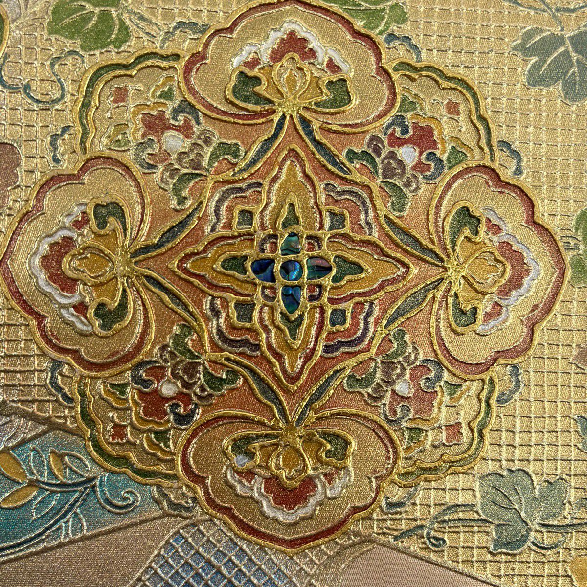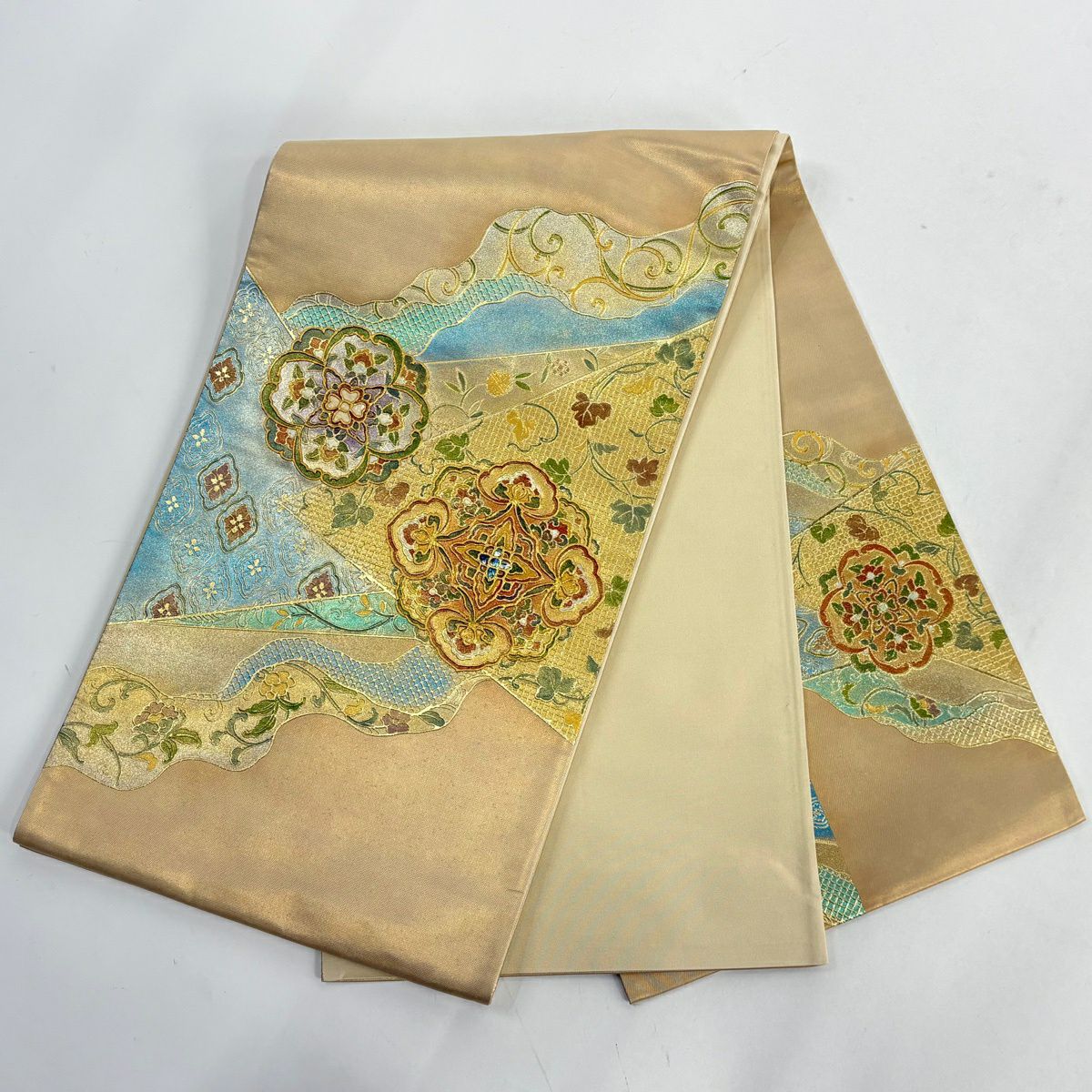 【美品】 名古屋帯 優品 草花 花器 螺鈿 金銀彩 ベージュ 正絹