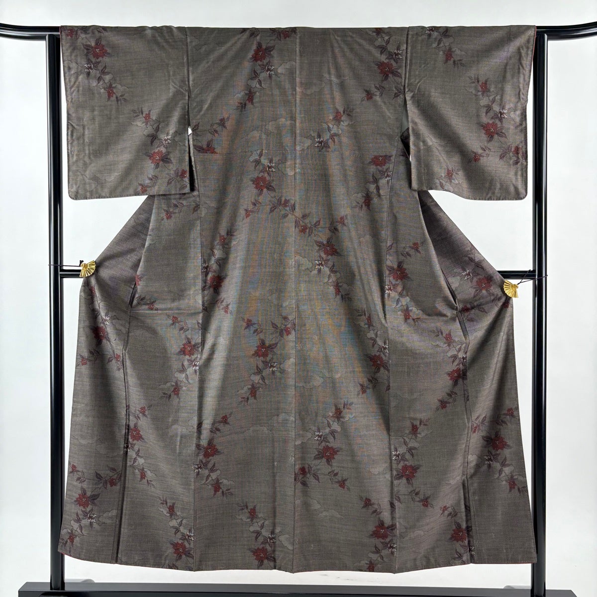【在庫一掃】 紬 身丈154.5cm 裄丈65cm M 袷 雲文 草花 黒 正絹 秀品