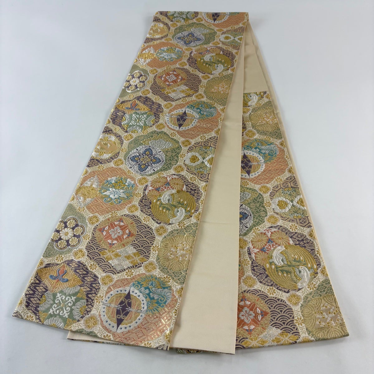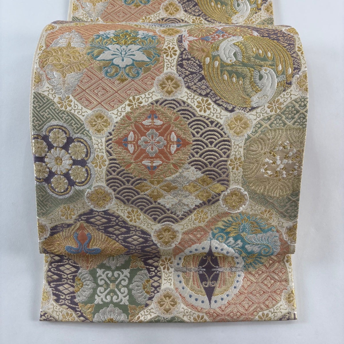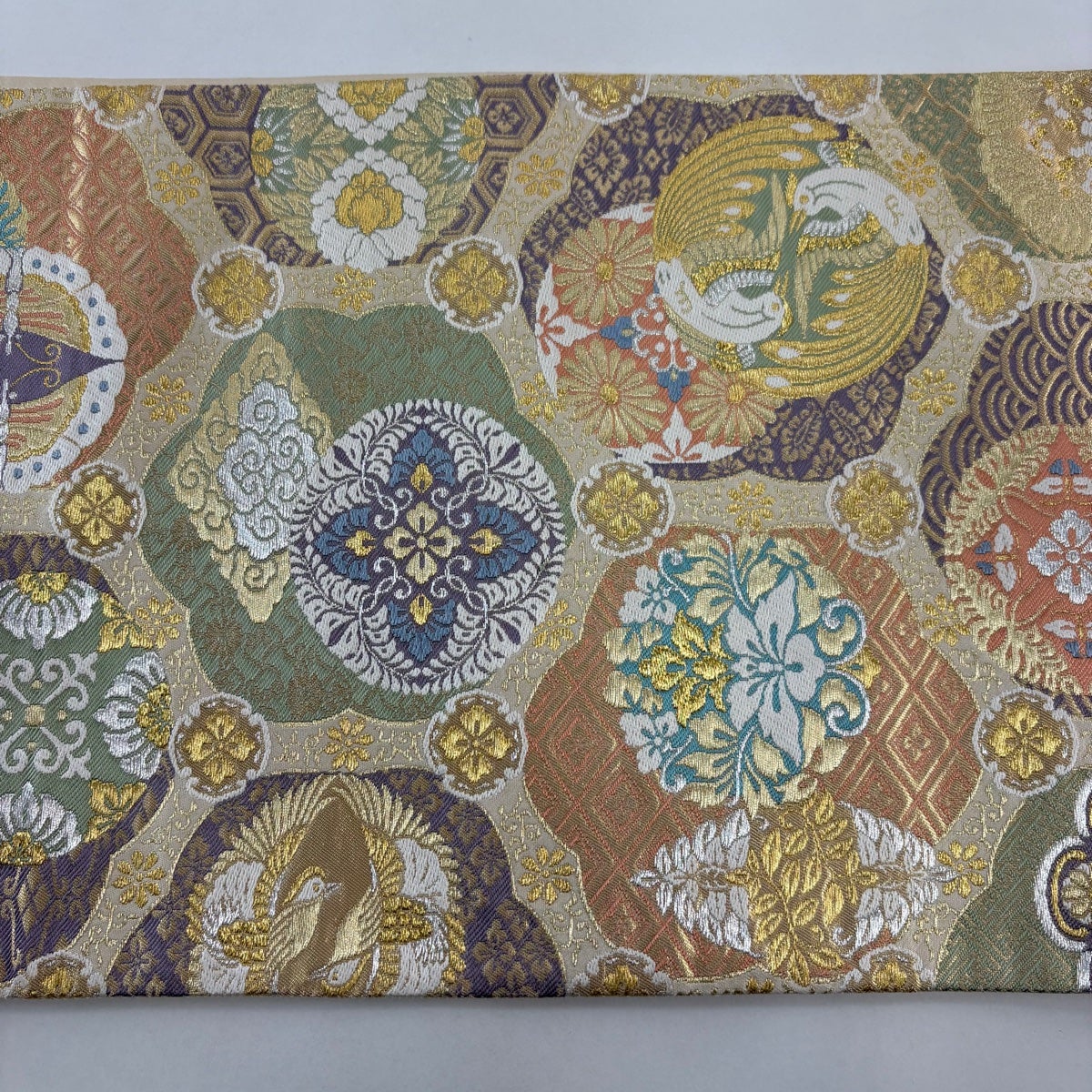袋帯 秀品 牡丹 鴛鴦 金糸 箔 金色 六通 正絹