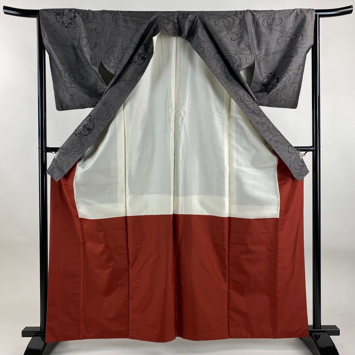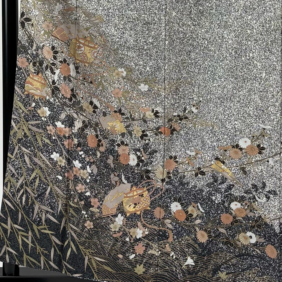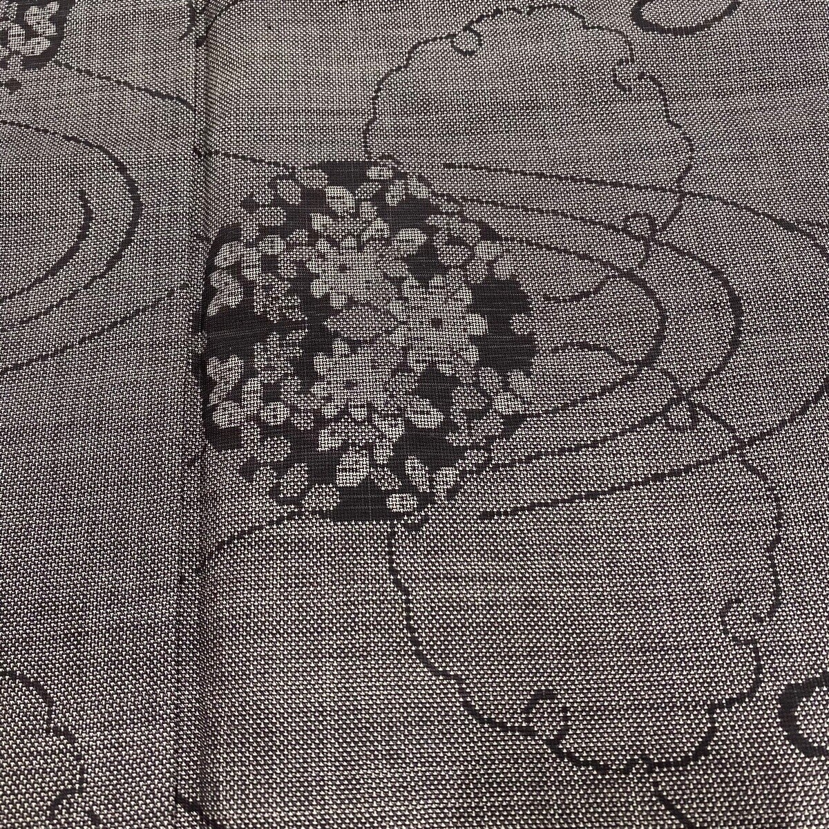 【美品】 紬 身丈162cm 裄丈64.5cm M 袷 雪輪 草花 黒灰 正絹 秀品