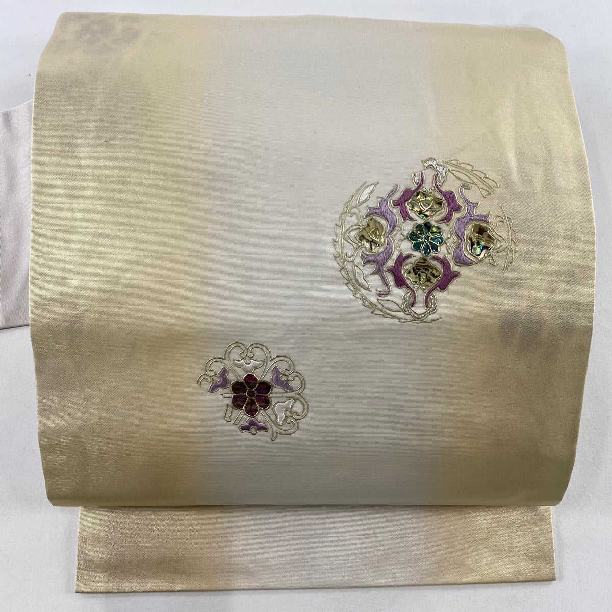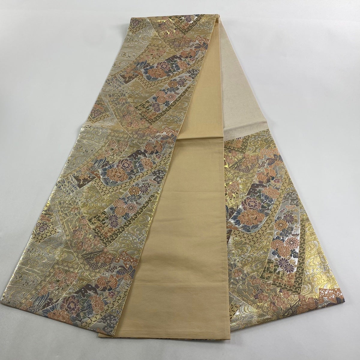 袋帯 秀品 京美 草花 桜 金糸 唐織 銀色 六通 正絹