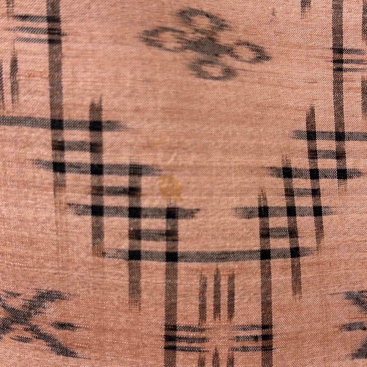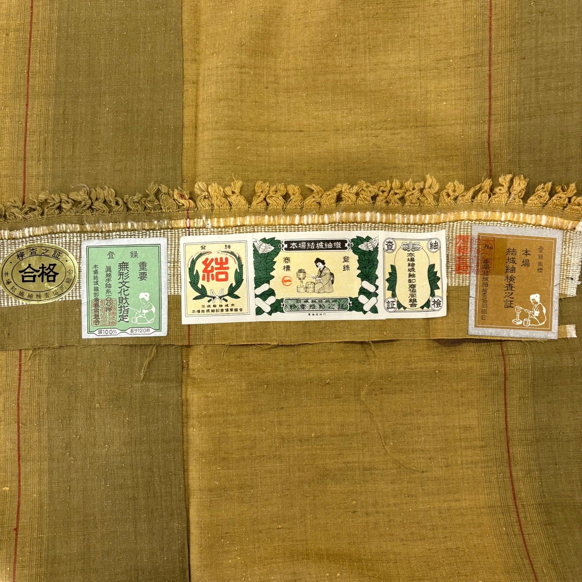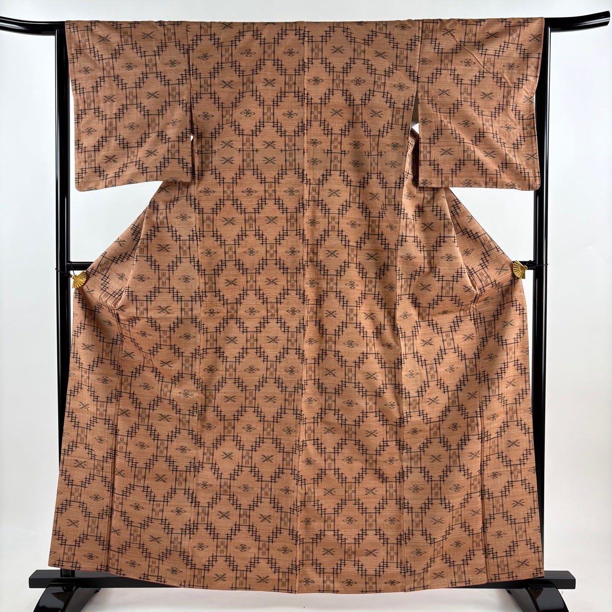 紬 身丈162.5cm 裄丈63.5cm S 袷 久米島紬 草木染 証紙あり 斜め格子 幾何学 茶色 正絹 逸品