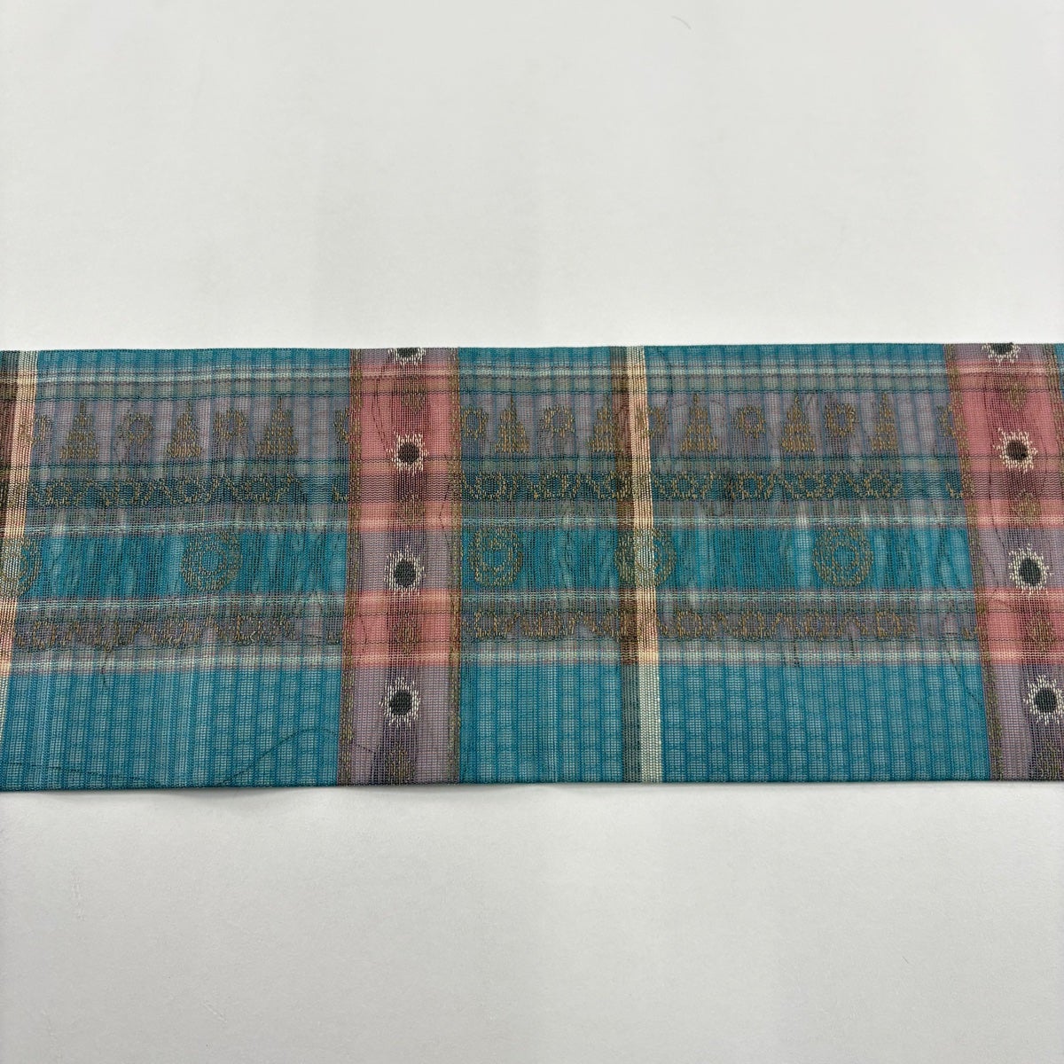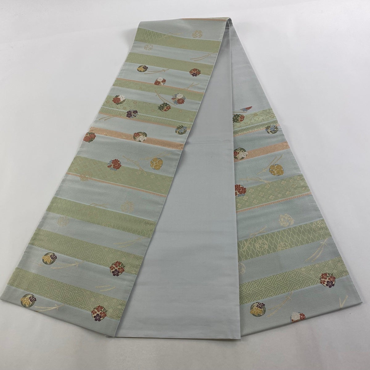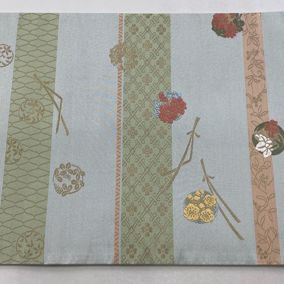 【美品】 袋帯 秀品 花丸文 縞 箔 水色 六通 正絹