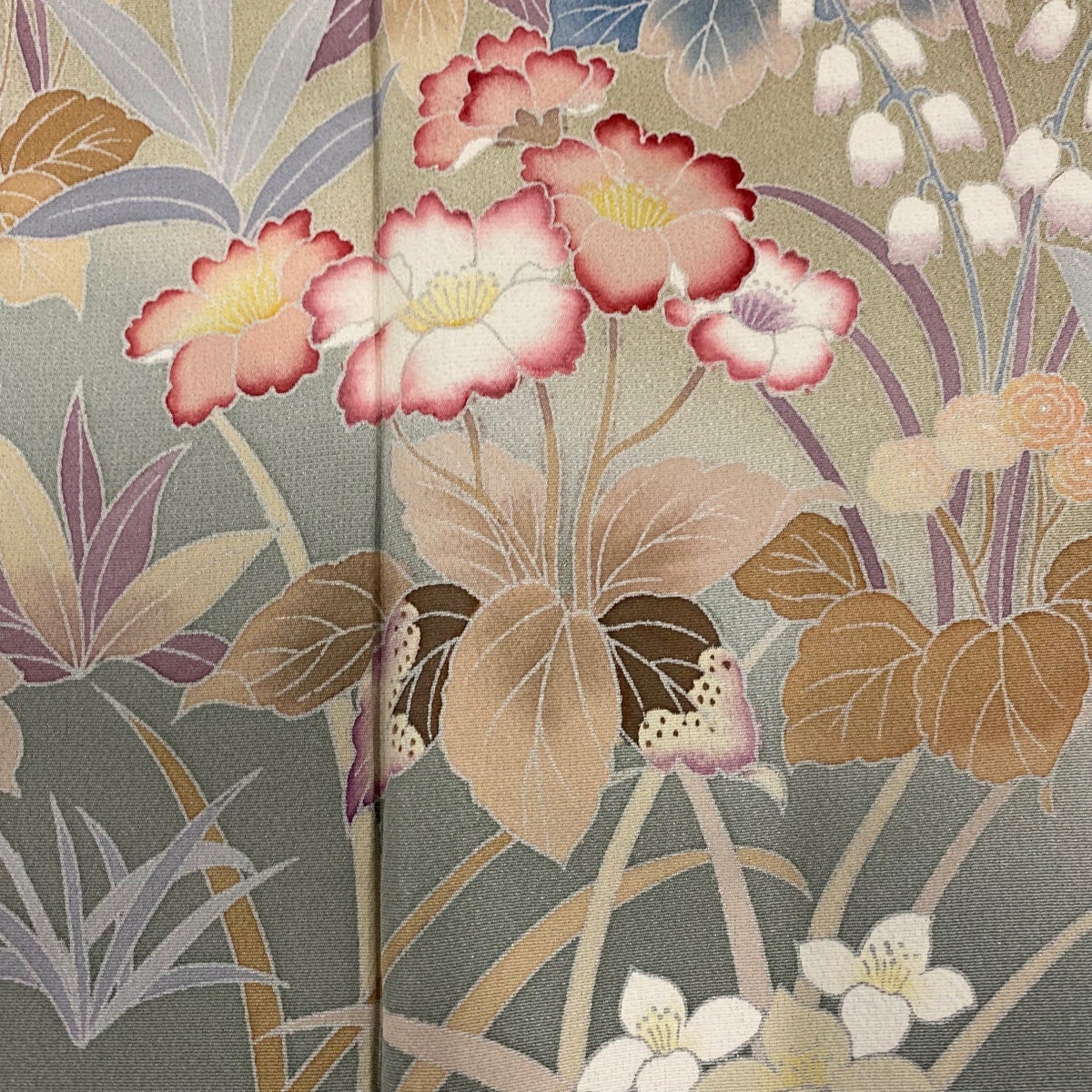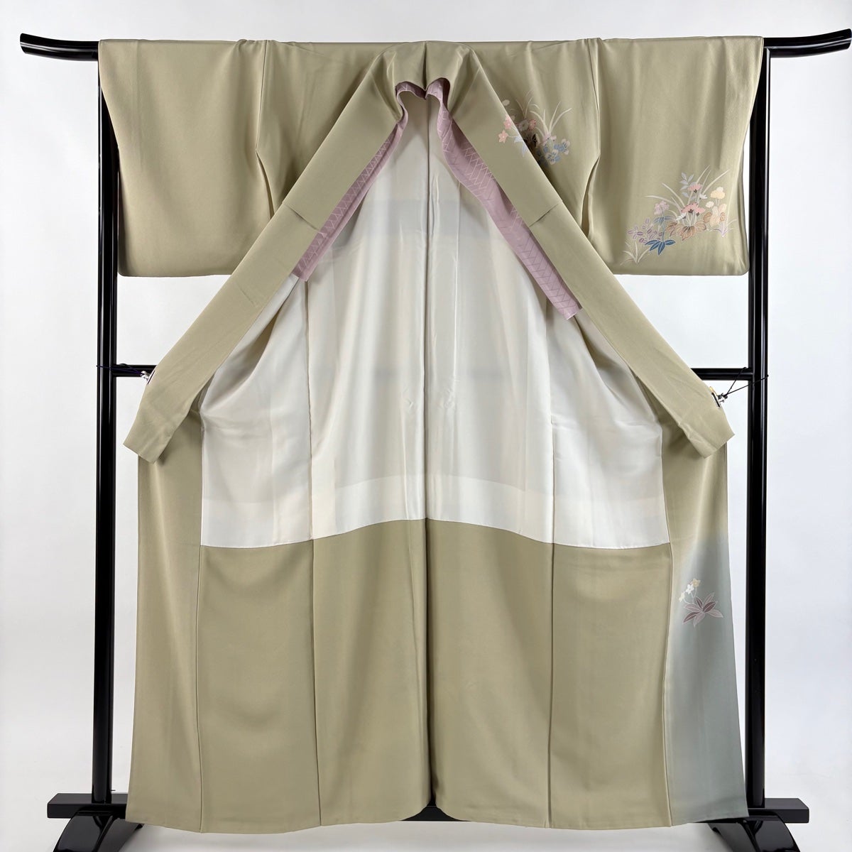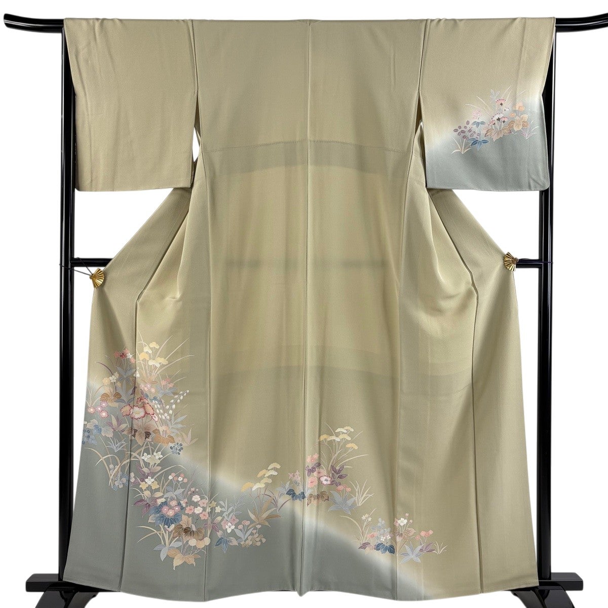 【美品】 訪問着 身丈159.5cm 裄丈65.5cm M 袷 草花 ぼかし ベージュ 正絹 秀品
