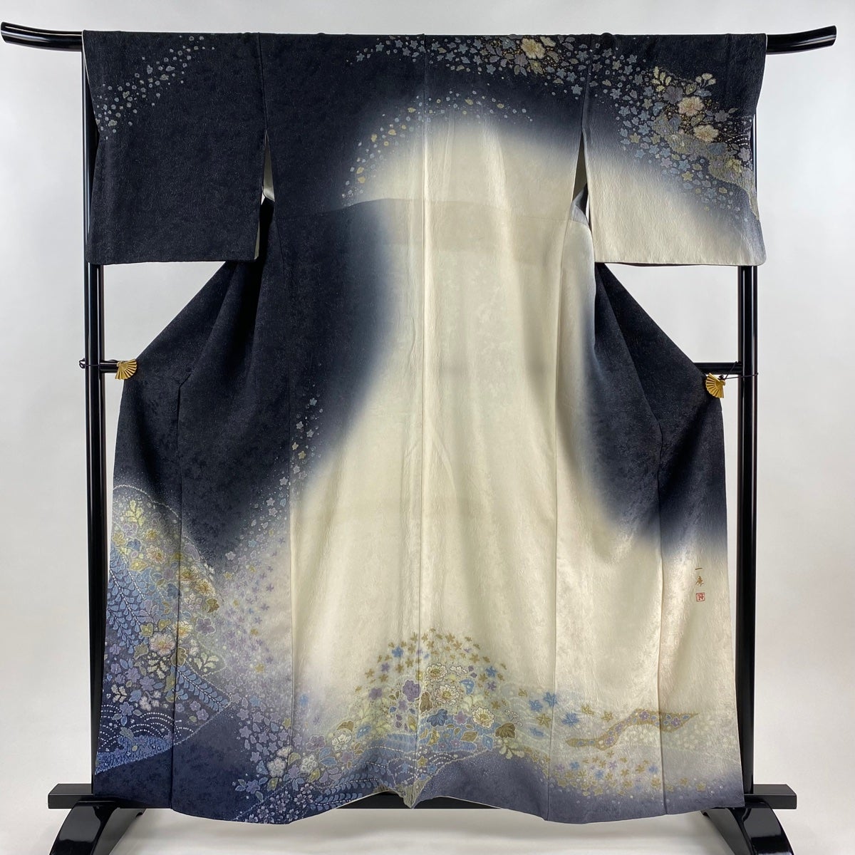 訪問着 身丈160cm 裄丈68.5cm L 袷 吉乃一廉 落款あり 辻が花 銀通し 金彩 墨色 正絹 逸品