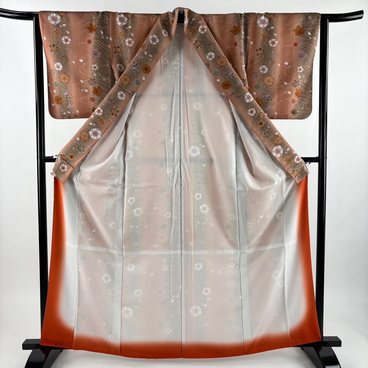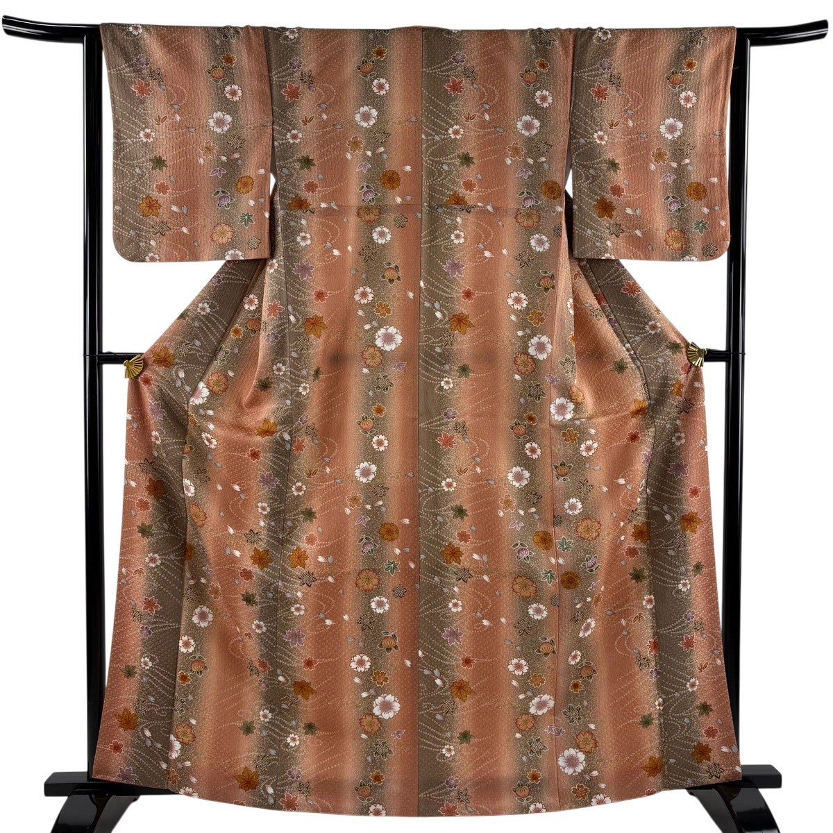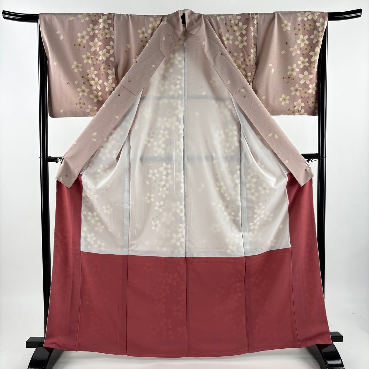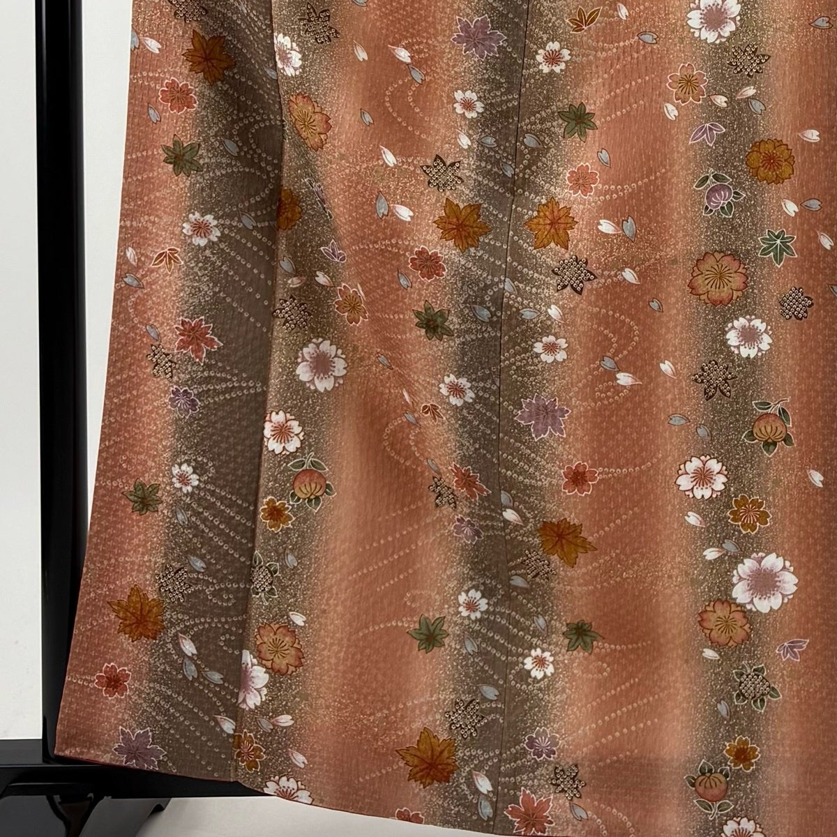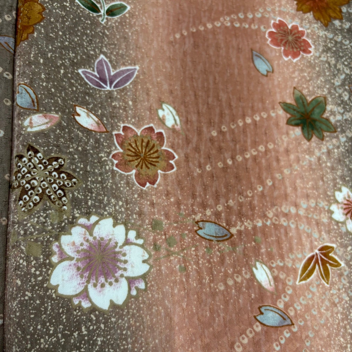 【美品】 小紋 身丈164cm 裄丈64cm M 袷 洗える着物 桜 楓 ぼかし ピンクベージュ 化繊 優品