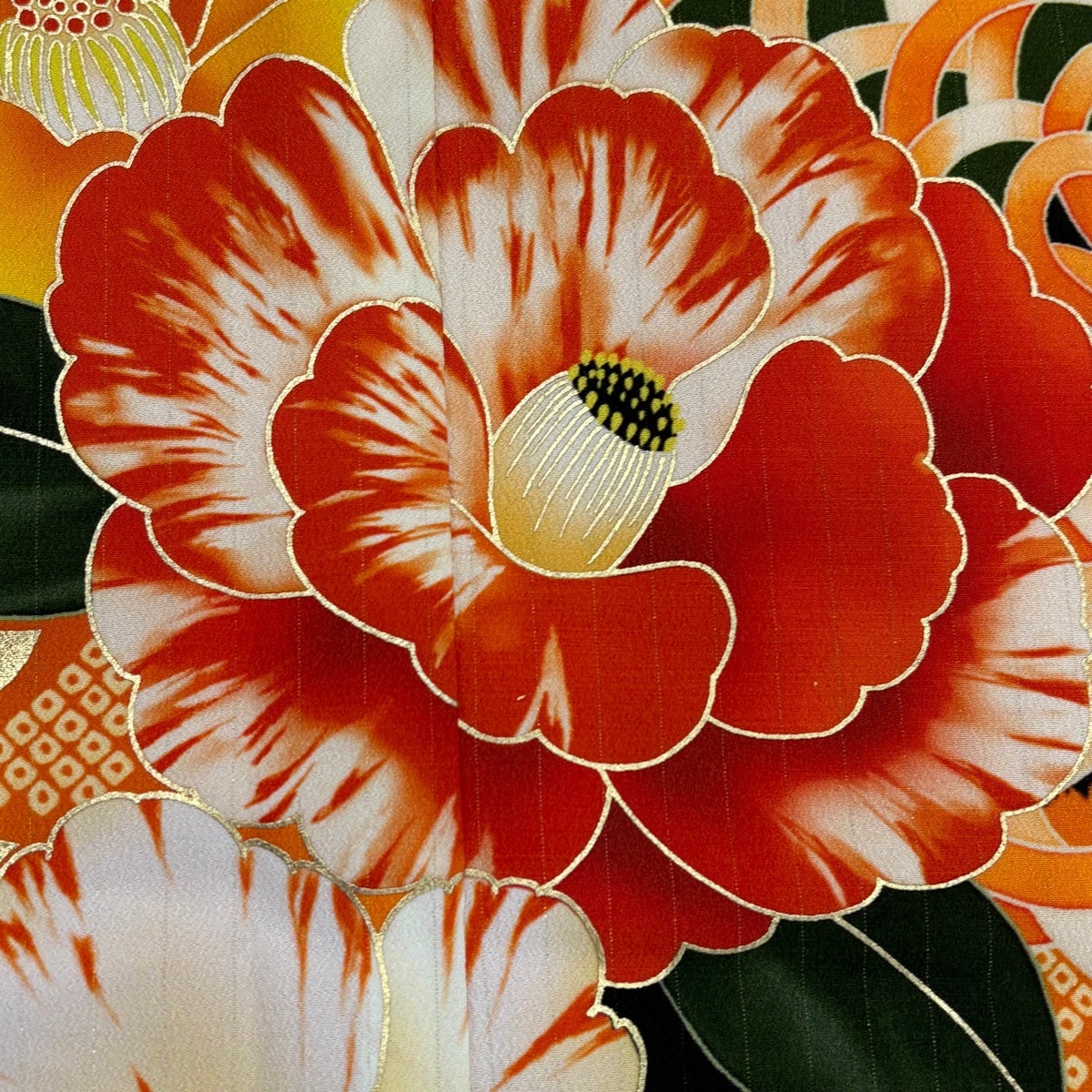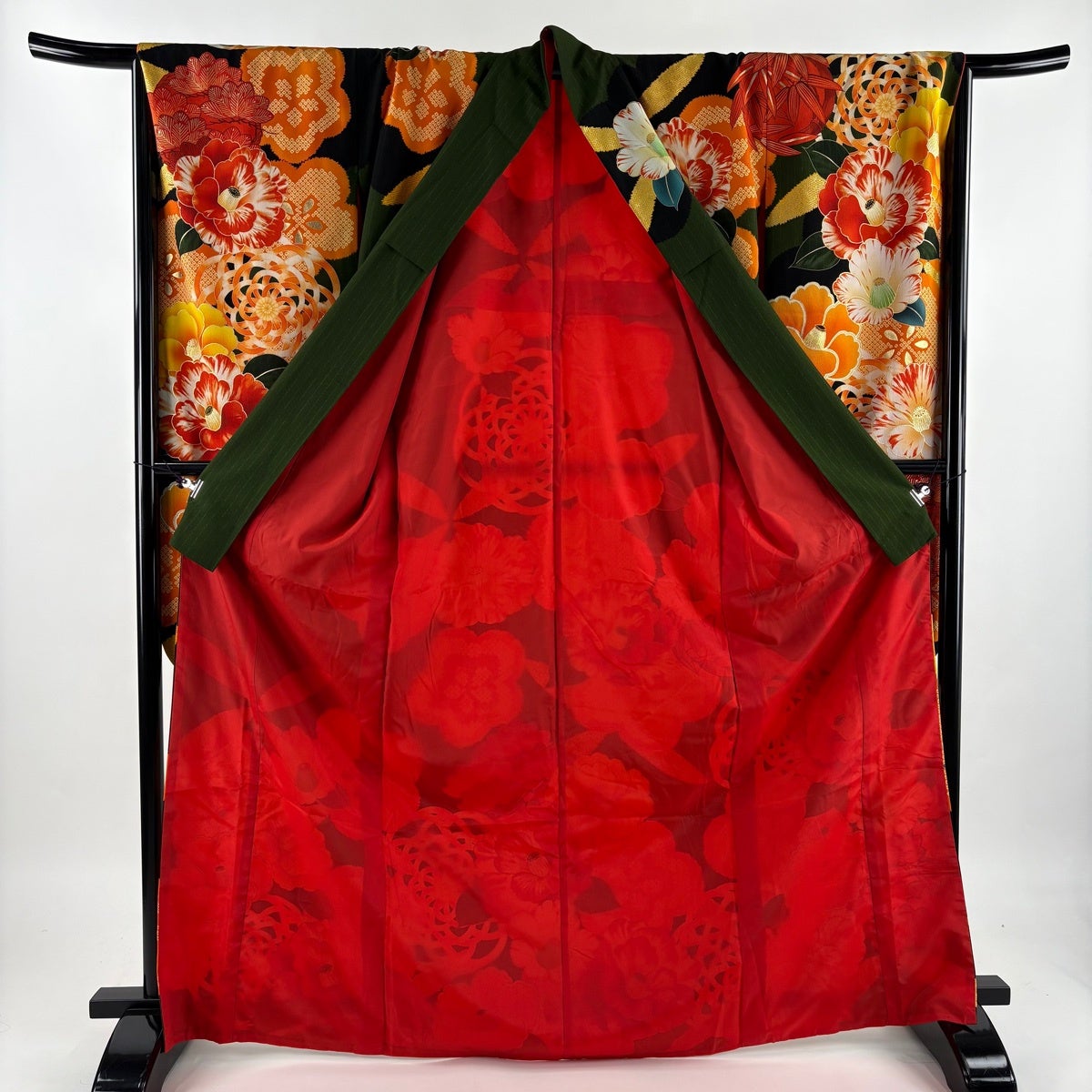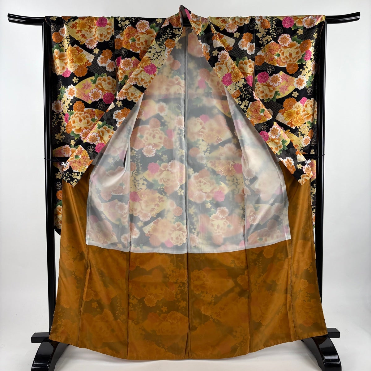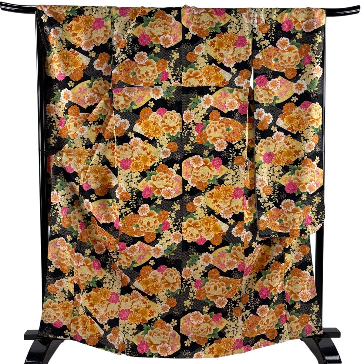 【美品】 振袖 身丈167cm 裄丈68cm L 袷 洗える着物 牡丹 扇面 金彩 黒 化繊 優品