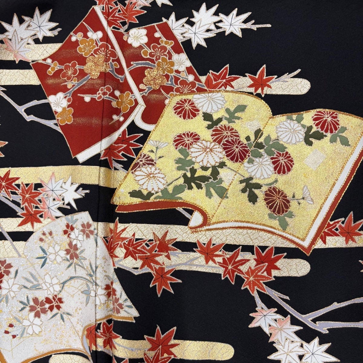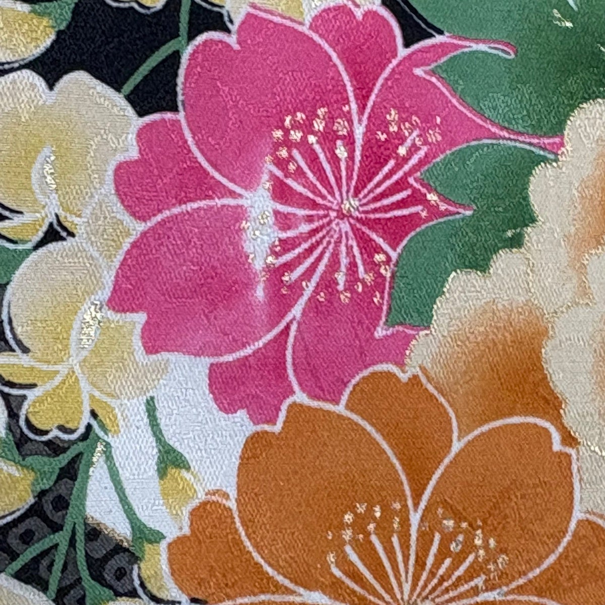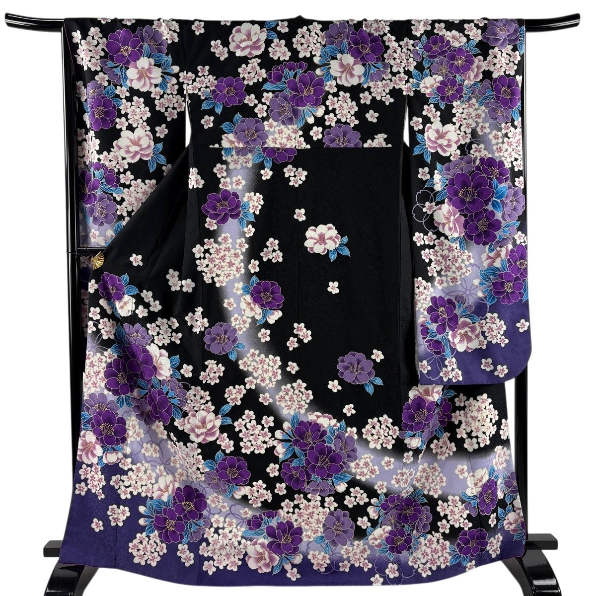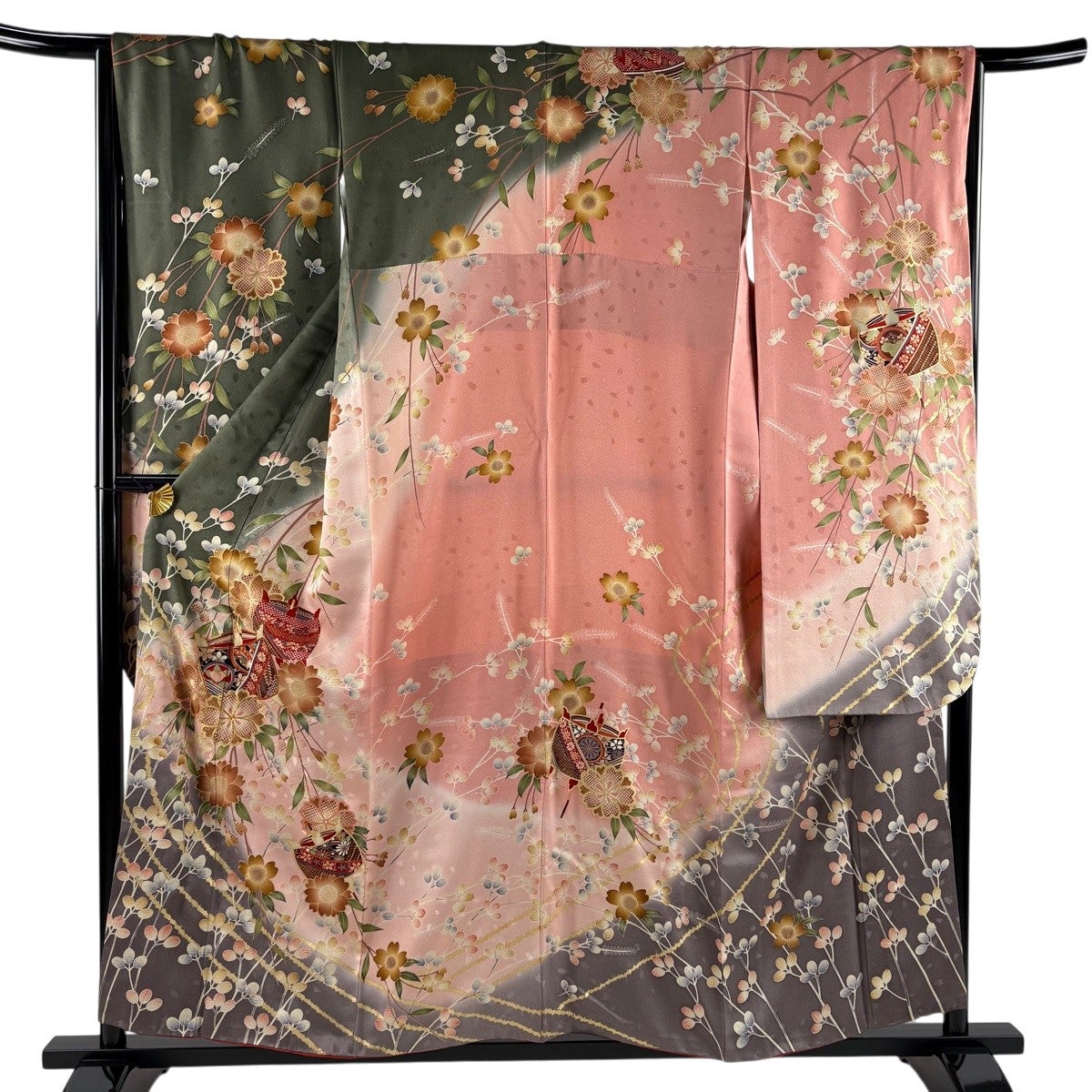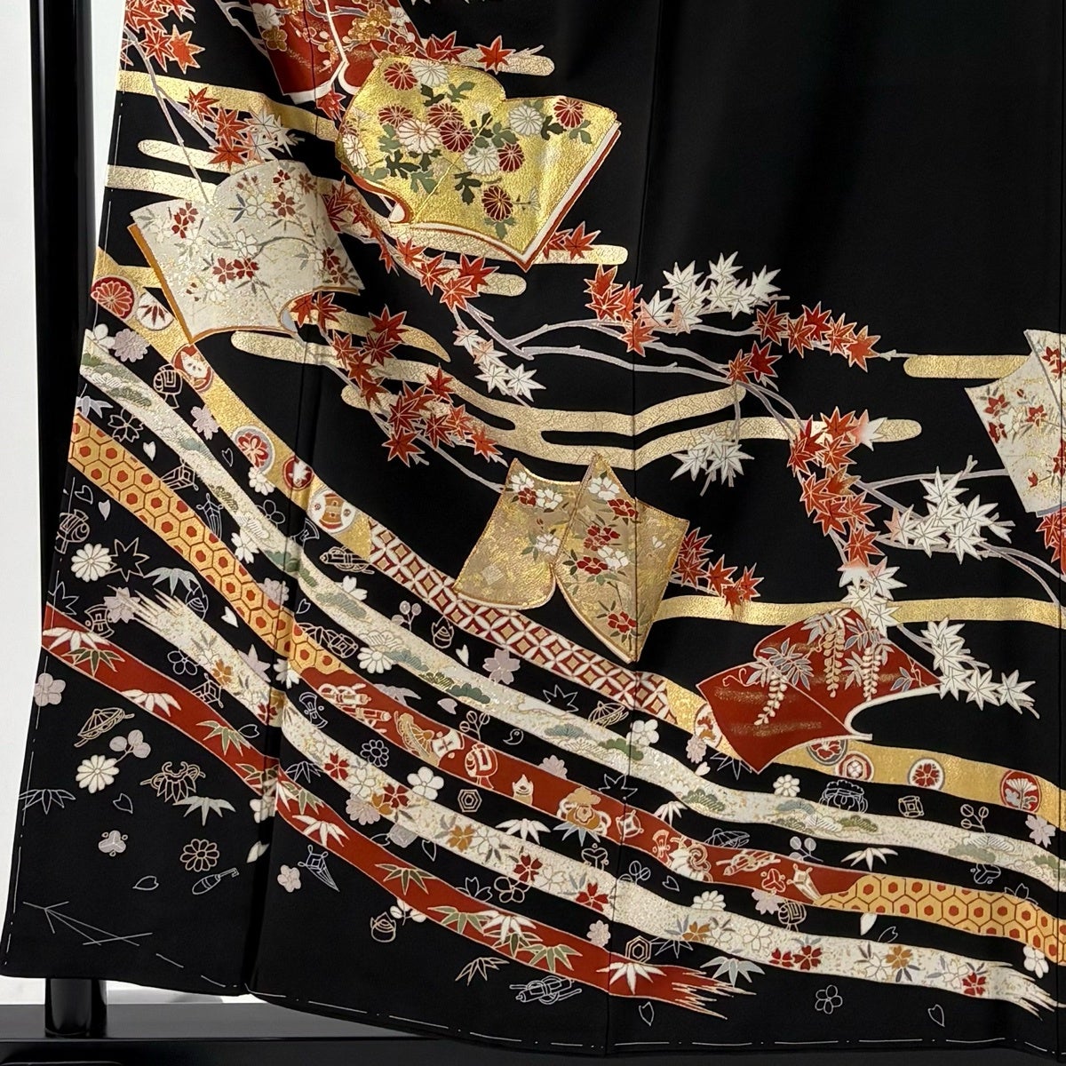 【美品】 振袖 身丈167cm 裄丈68cm L 袷 洗える着物 牡丹 扇面 金彩 黒 化繊 優品