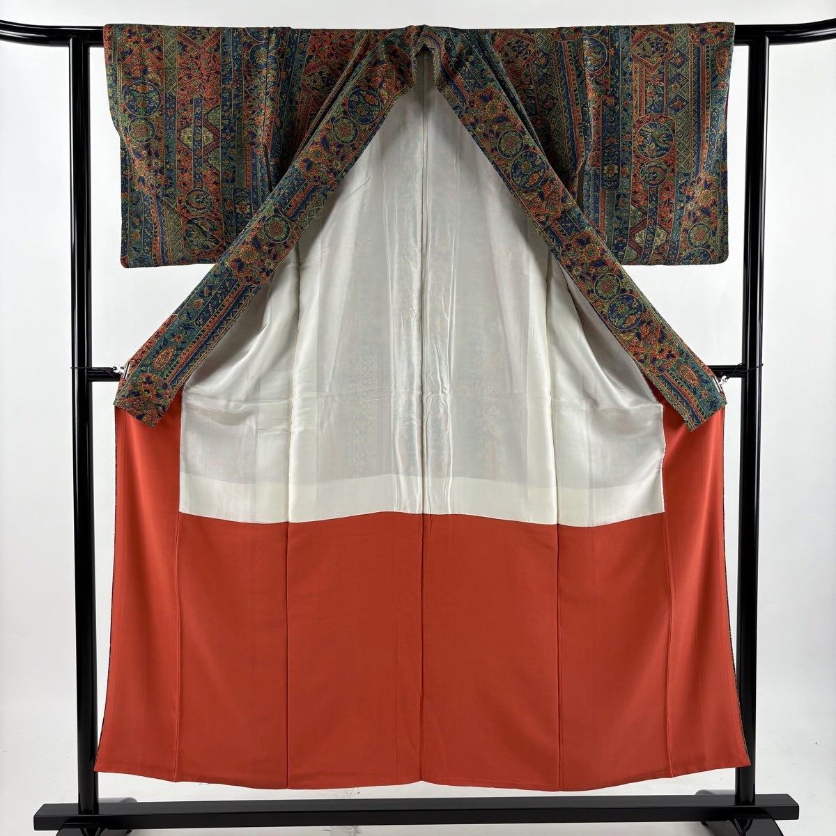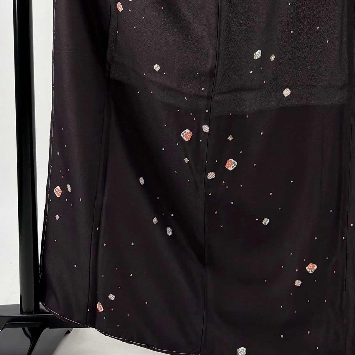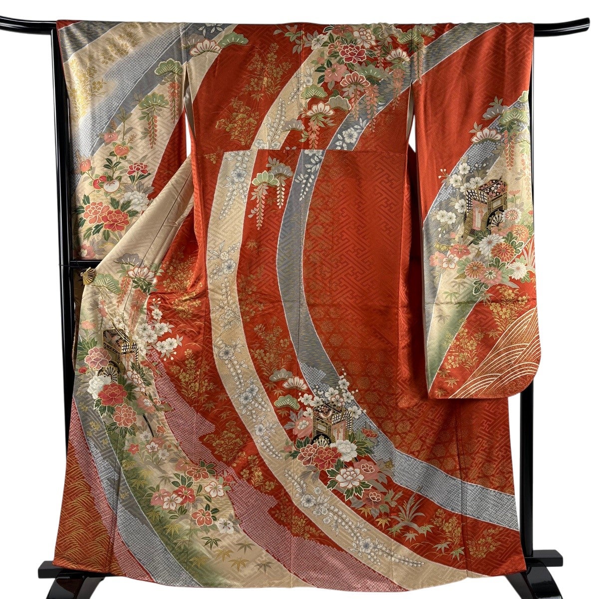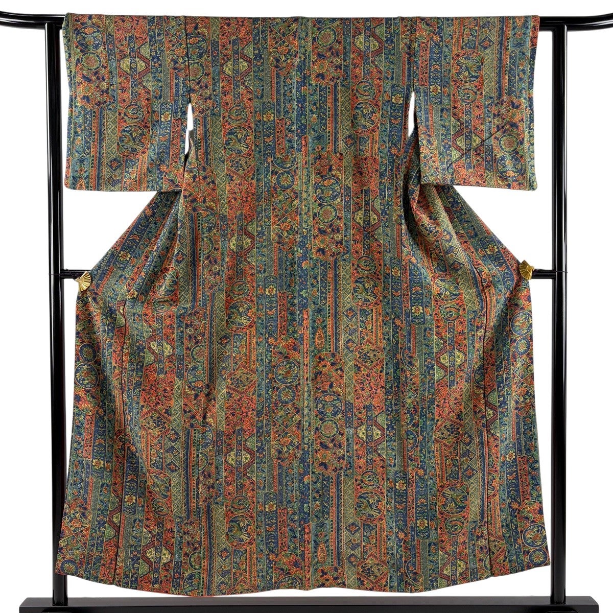 【美品】 振袖 身丈167cm 裄丈68cm L 袷 洗える着物 牡丹 扇面 金彩 黒 化繊 優品