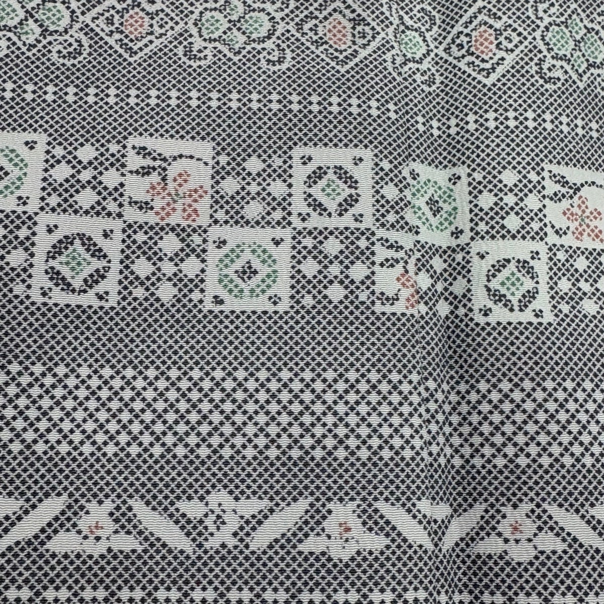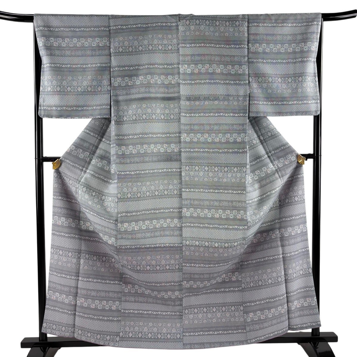 【美品】 小紋 身丈162cm 裄丈66.5cm M 袷 洗える着物 横段 市松 灰色 化繊 優品