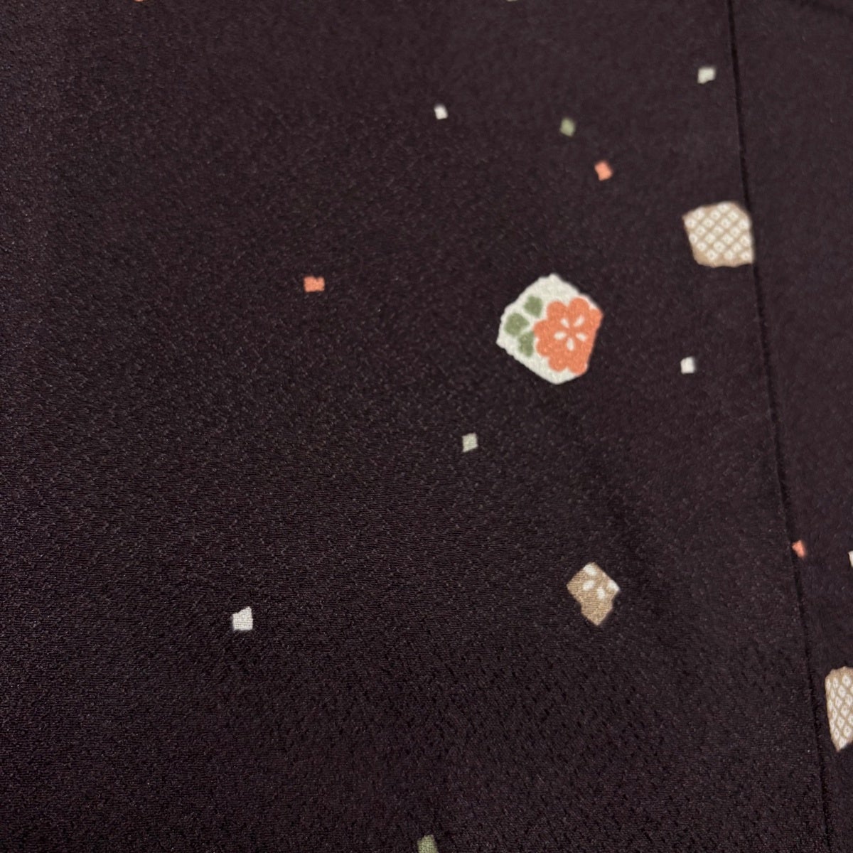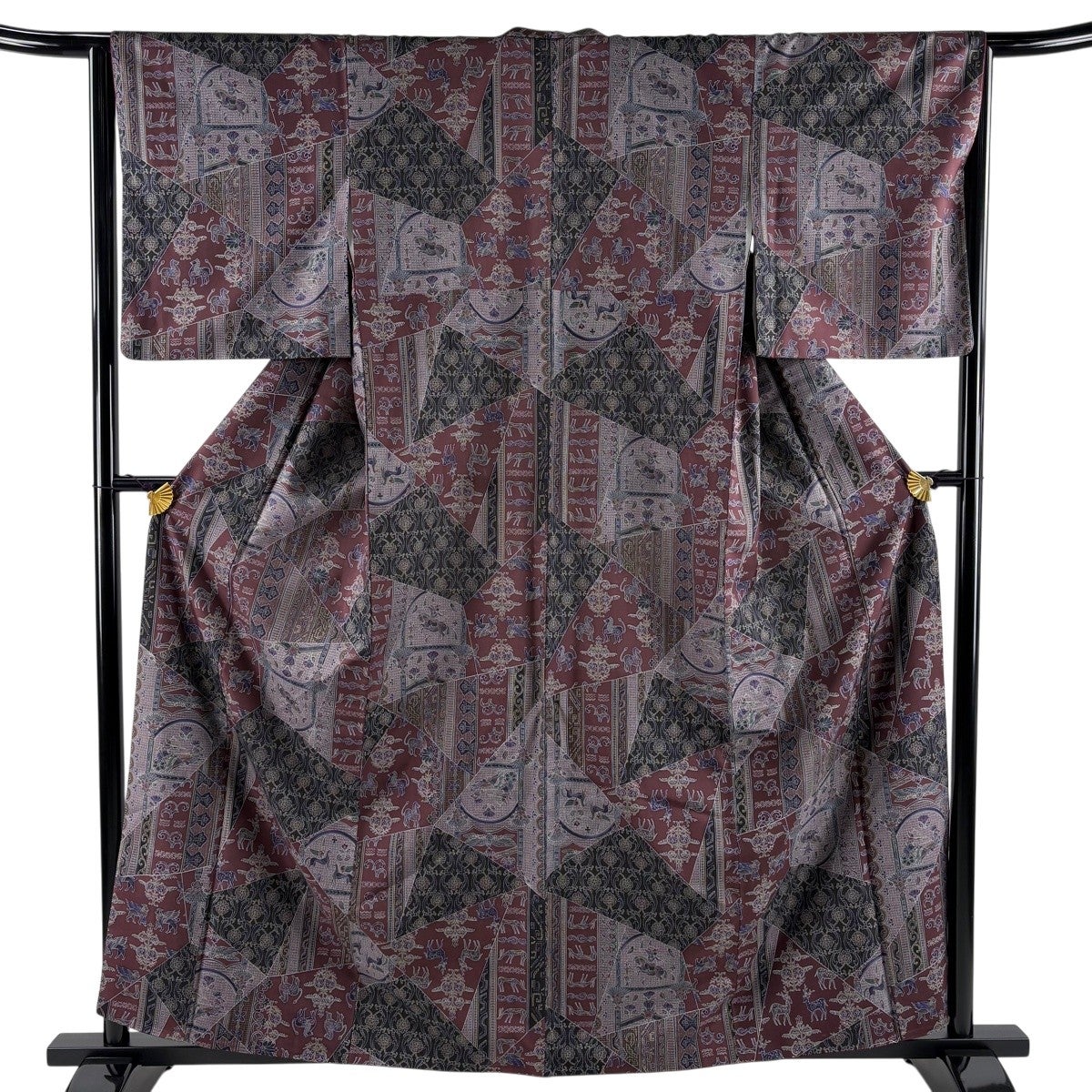 【美品】 小紋 身丈165cm 裄丈66.5cm M 袷 洗える着物 草花 幾何学模様 濃紫 化繊 優品