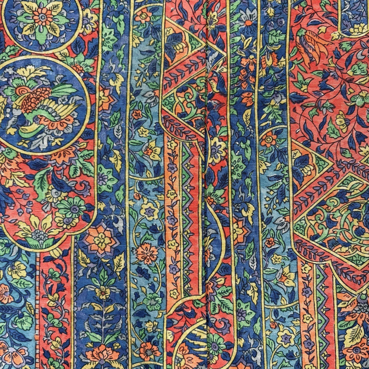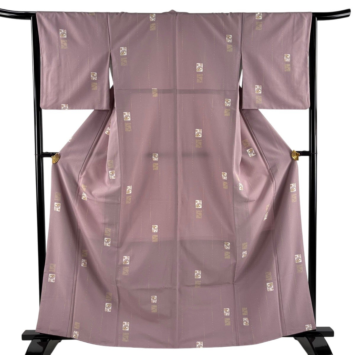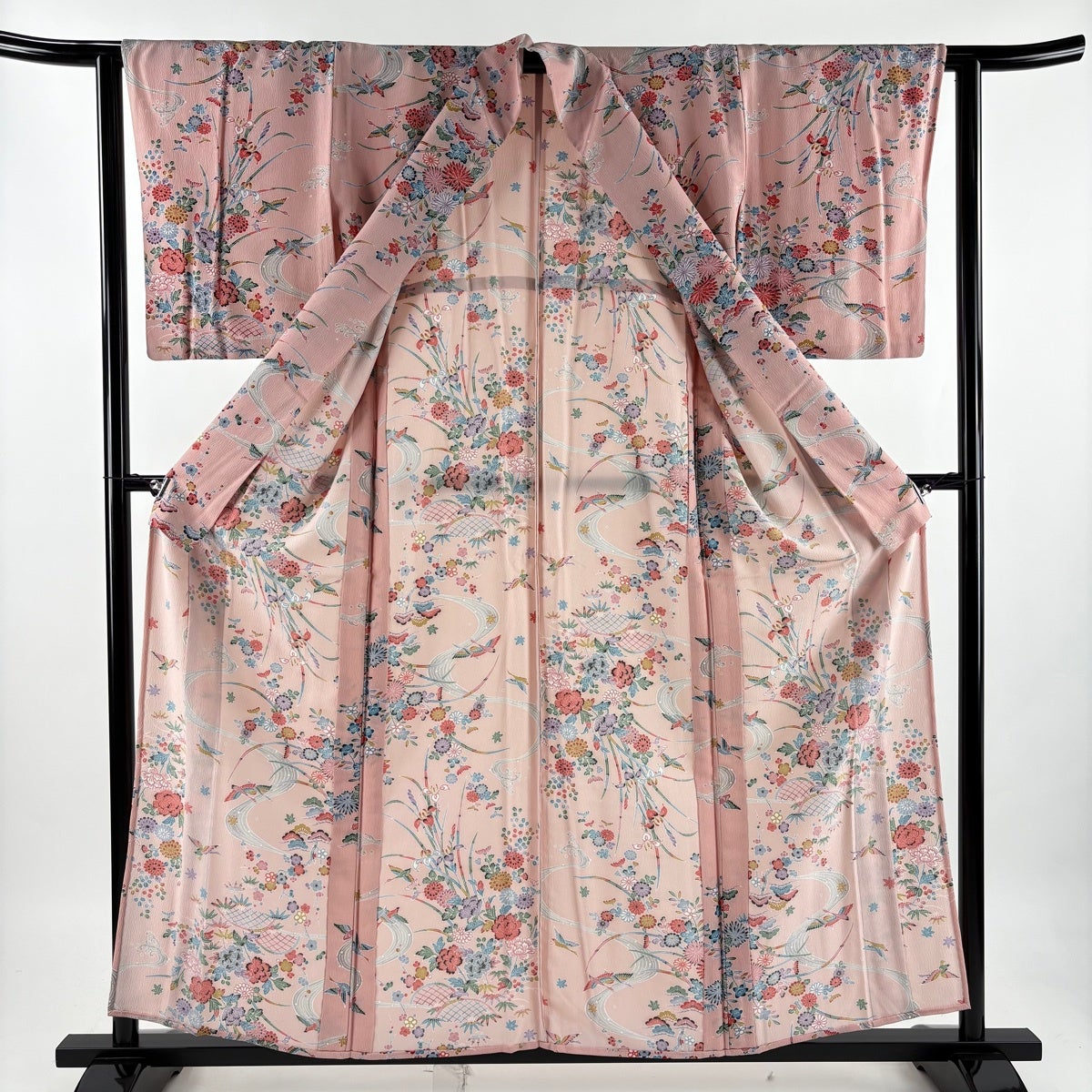 小紋 身丈156.5cm 裄丈63cm S 単衣 洗える着物 花鳥 流水 ピンク 化繊 優品