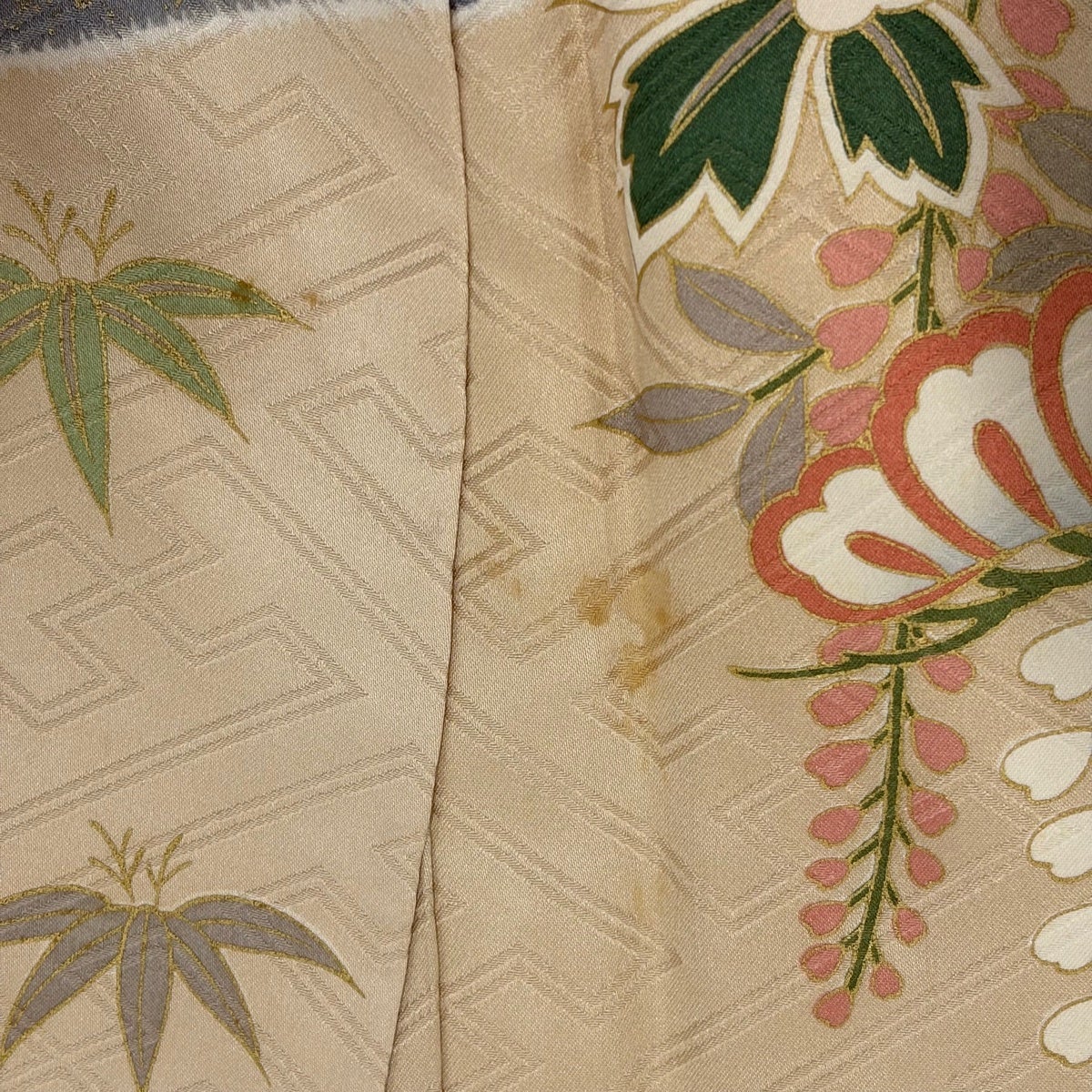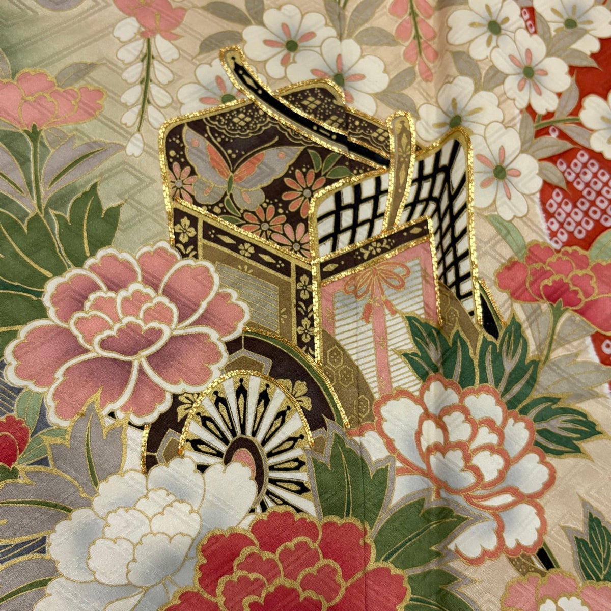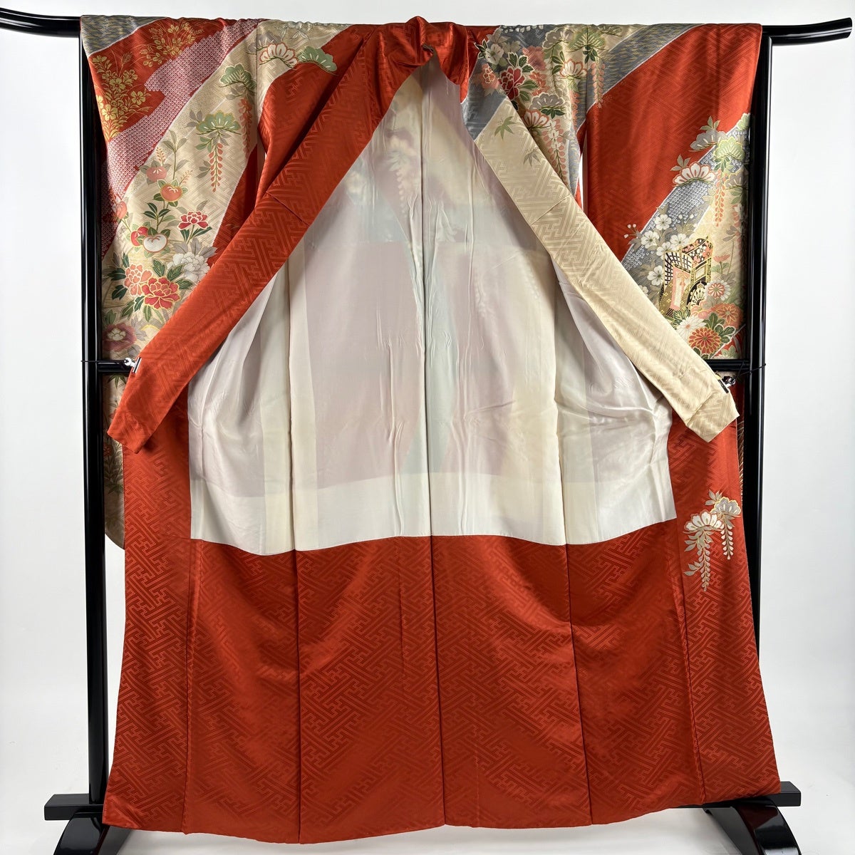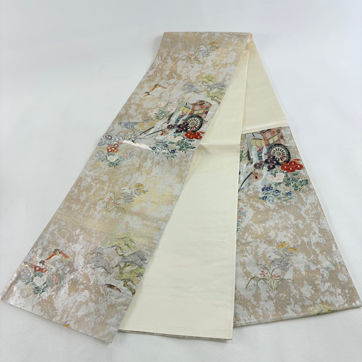 振袖 身丈162.5cm 裄丈66cm M 袷 御所車 草花 金糸 金彩 ベージュ 正絹 優品