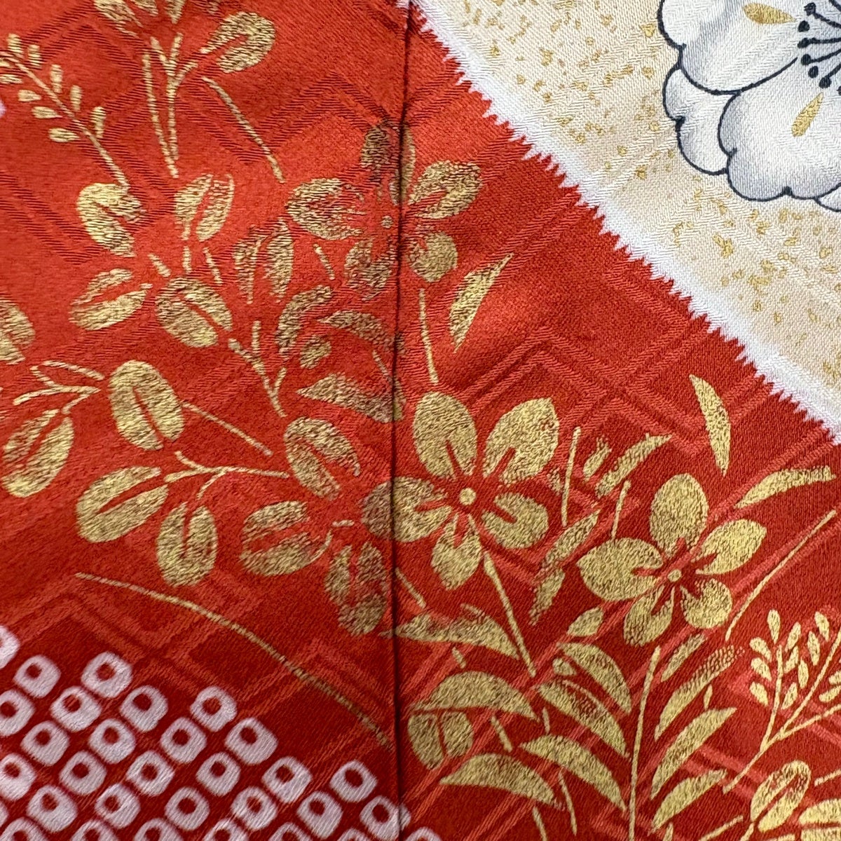 【美品】 振袖 身丈170.5cm 裄丈68.5cm L 袷 洗える着物 椿 花 金彩 金糸 茶緑色 化繊 優品