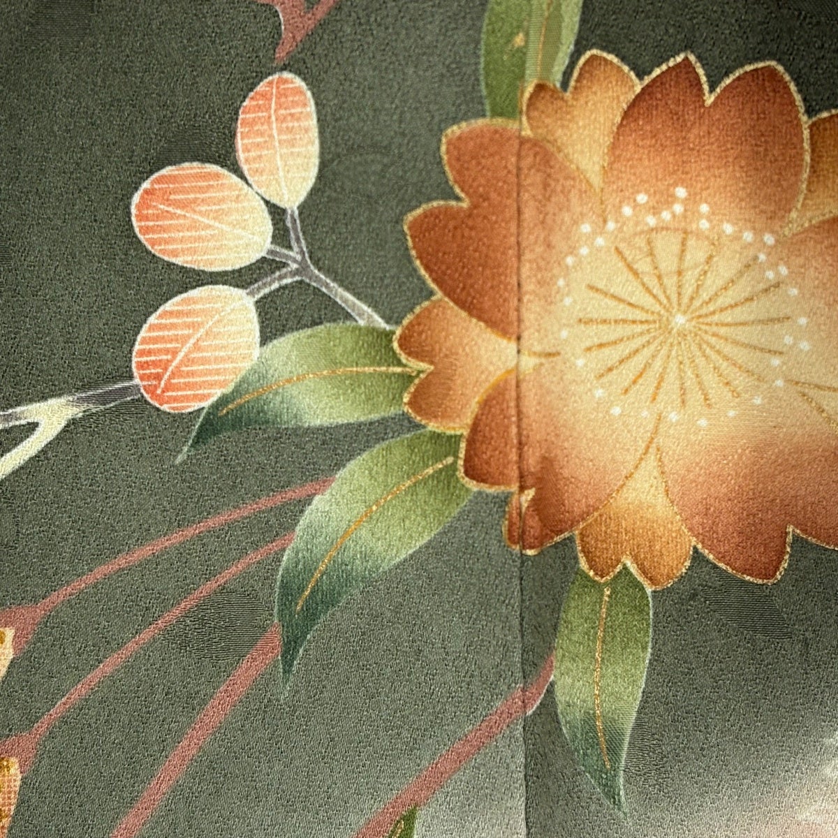 【美品】 振袖 身丈156cm 裄丈66.5cm M 袷 糸巻き 桜 金糸 金彩 茶緑色 正絹 優品