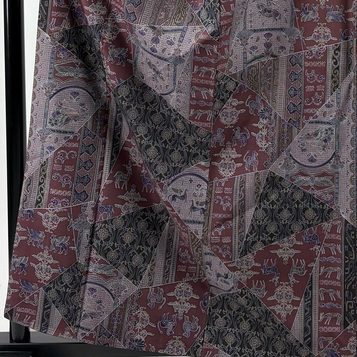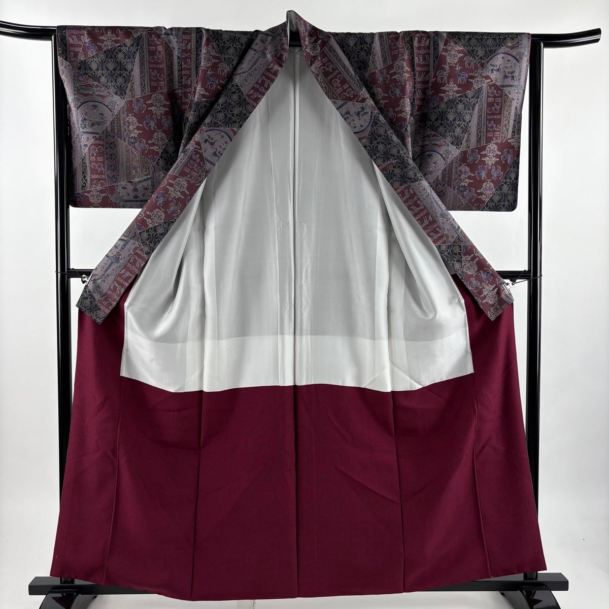 【美品】 小紋 身丈161.5cm 裄丈64.5cm M 袷 紬地 動物 草花 赤紫 正絹 優品