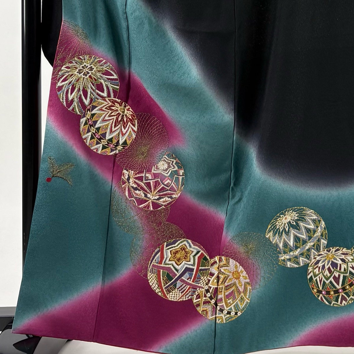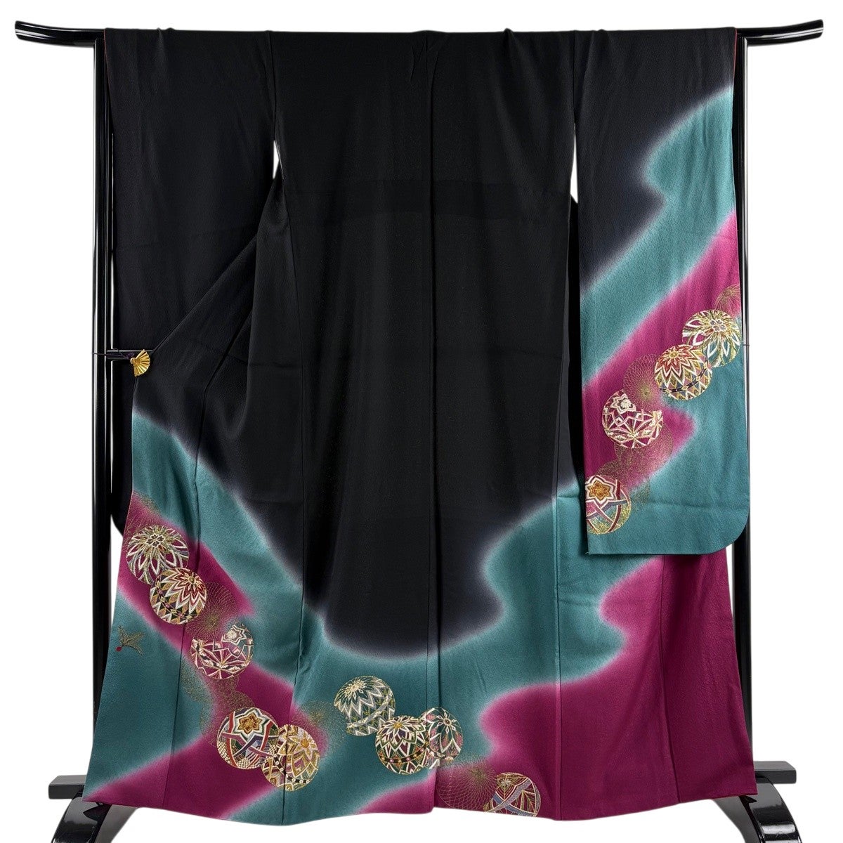 振袖 身丈164cm 裄丈65.5cm M 袷 手鞠 羽根 金糸 染め分け 黒 正絹 秀品