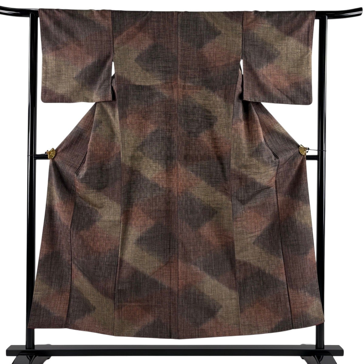 【美品】 紬 身丈152.5cm 裄丈62.5cm S 袷 縞 幾何学模様 焦茶色 正絹 秀品