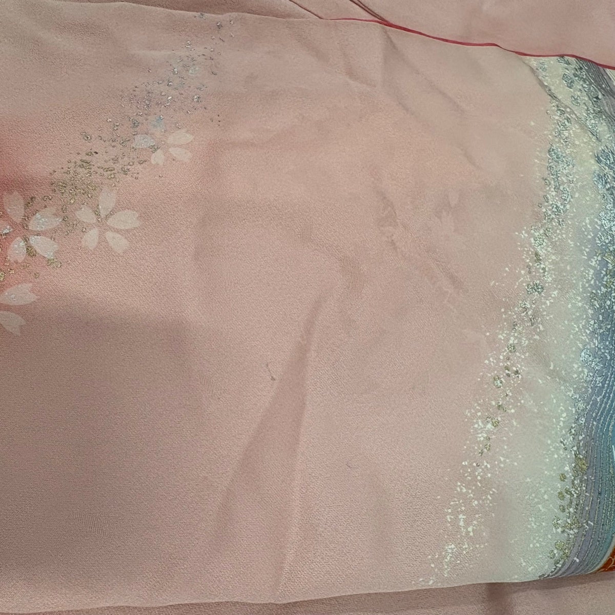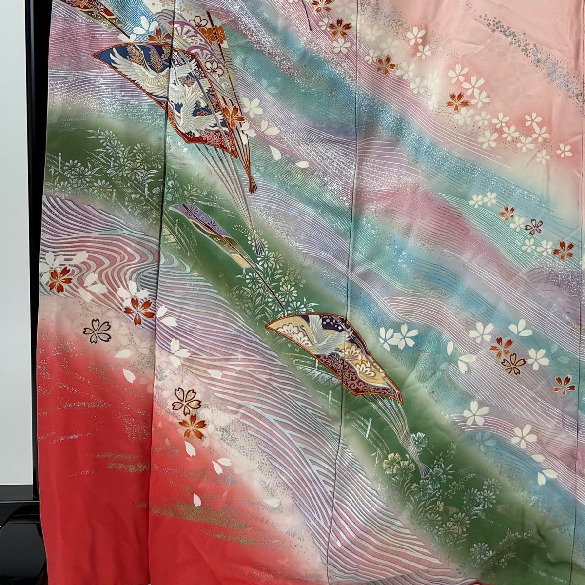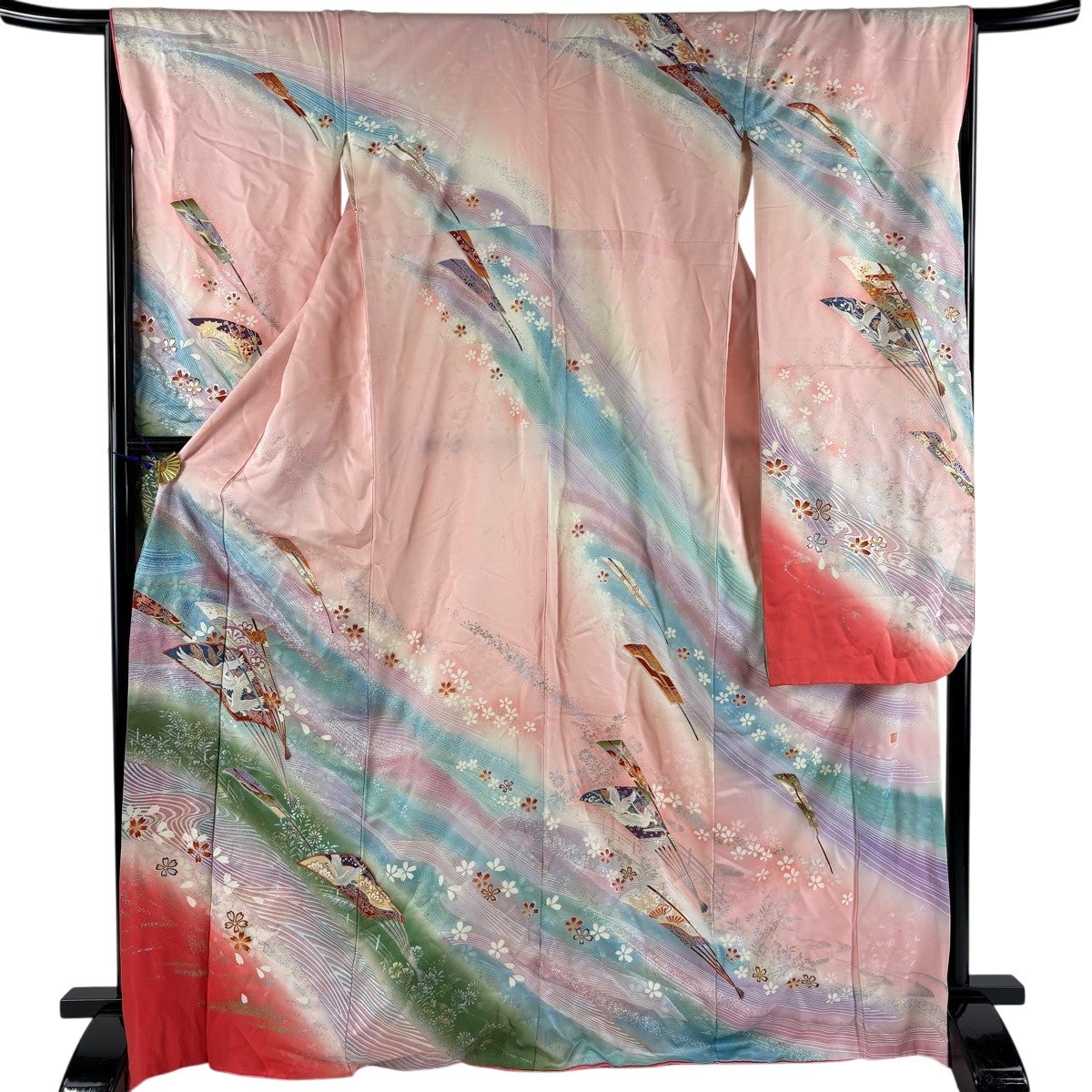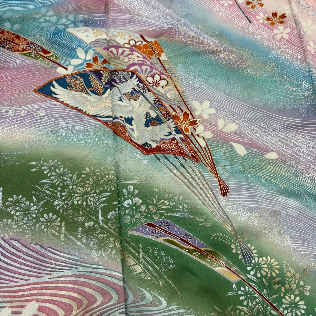 振袖 身丈169.5cm 裄丈66.5cm M 袷 落款あり 扇 桜 金銀彩 金糸 ピンク 正絹 秀品