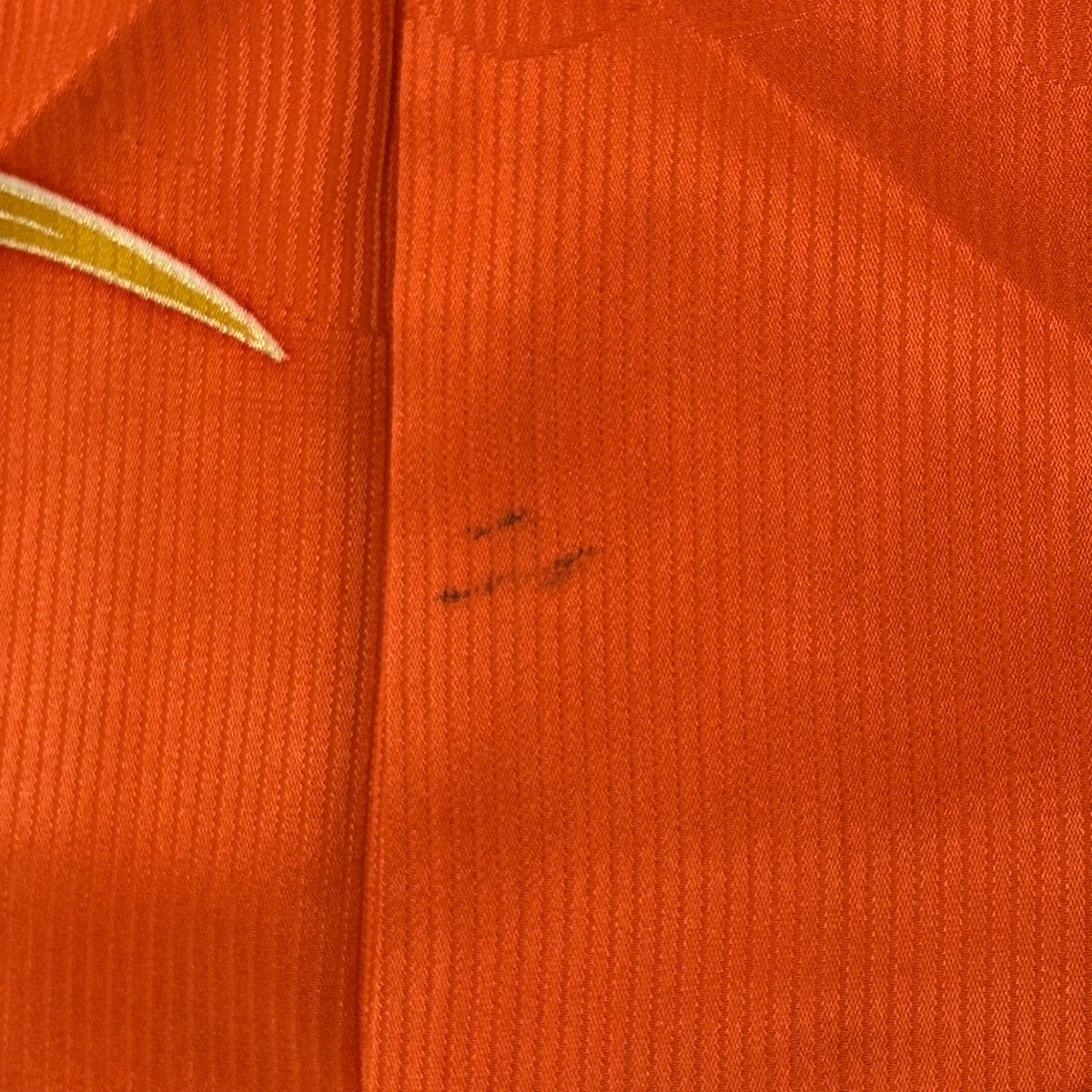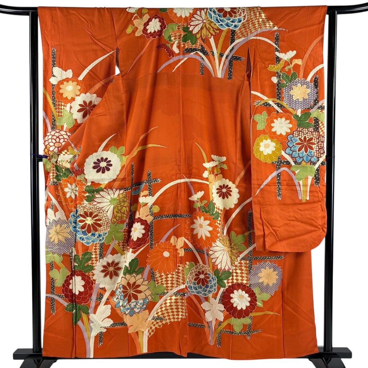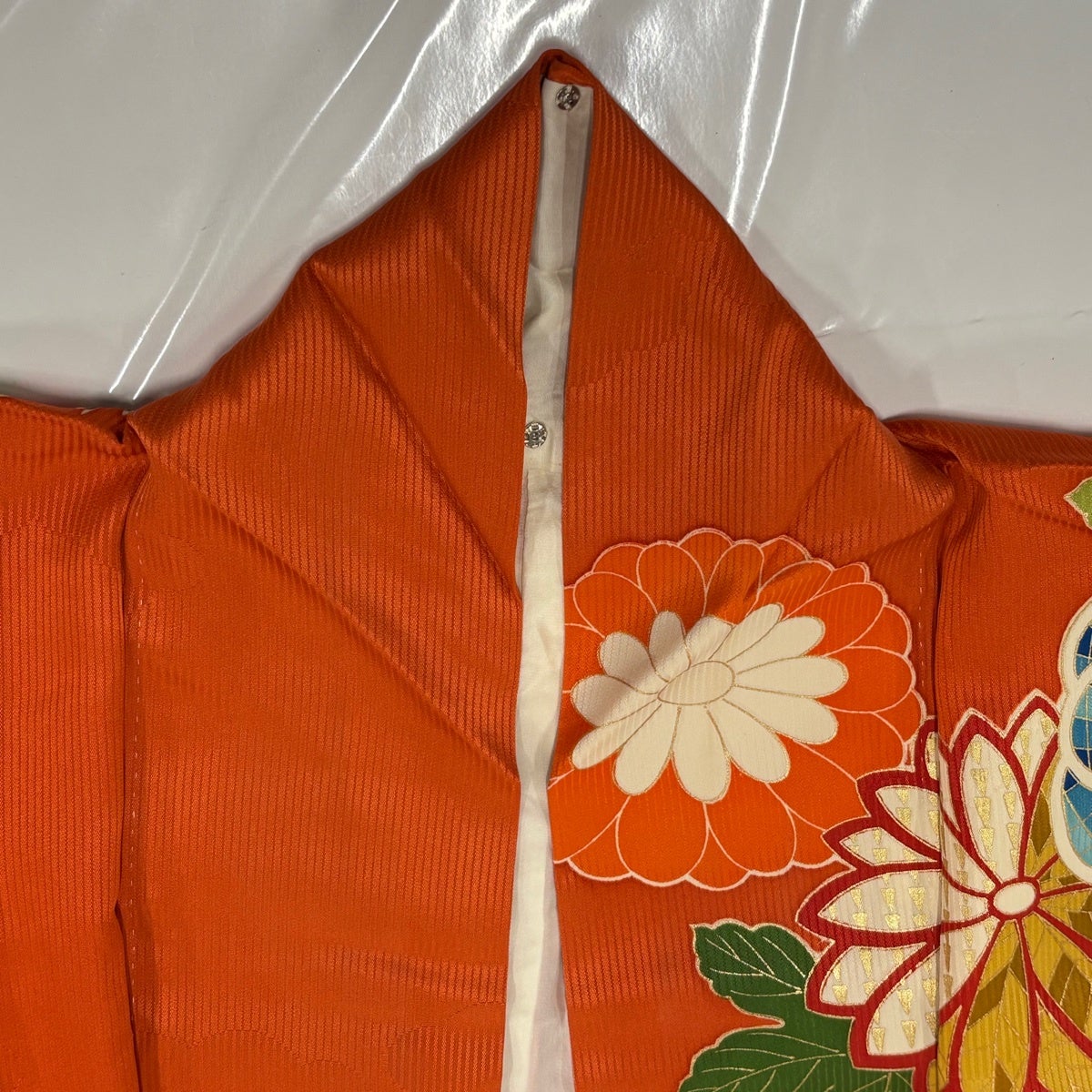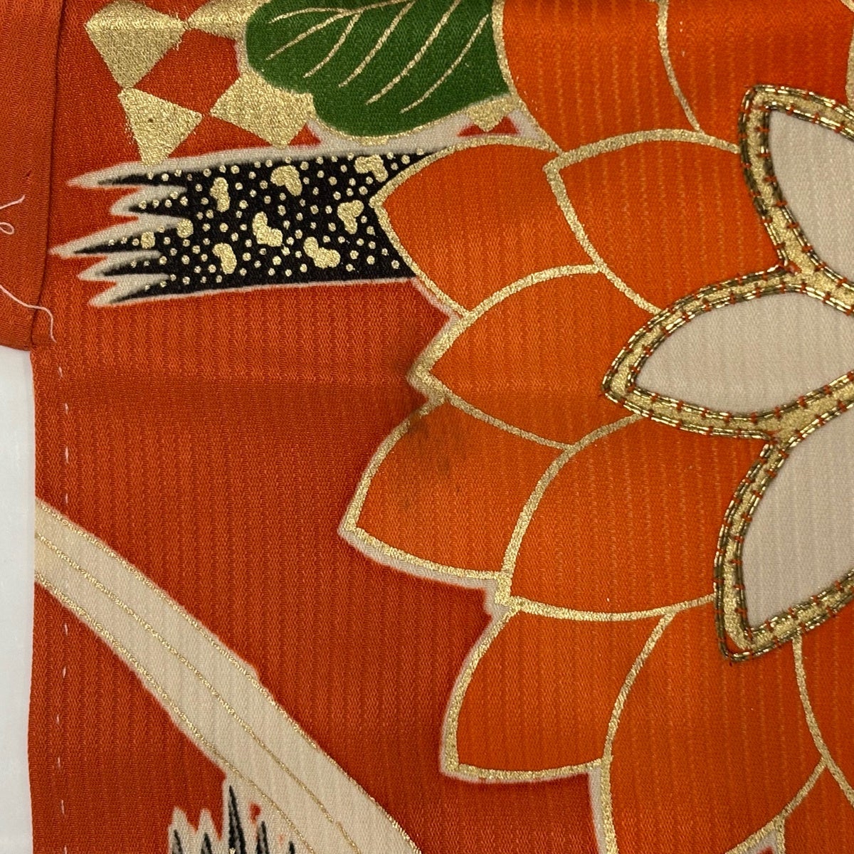 振袖 身丈158cm 裄丈63.5cm S 袷 菊 地紋 金糸 金彩 オレンジ 正絹 秀品