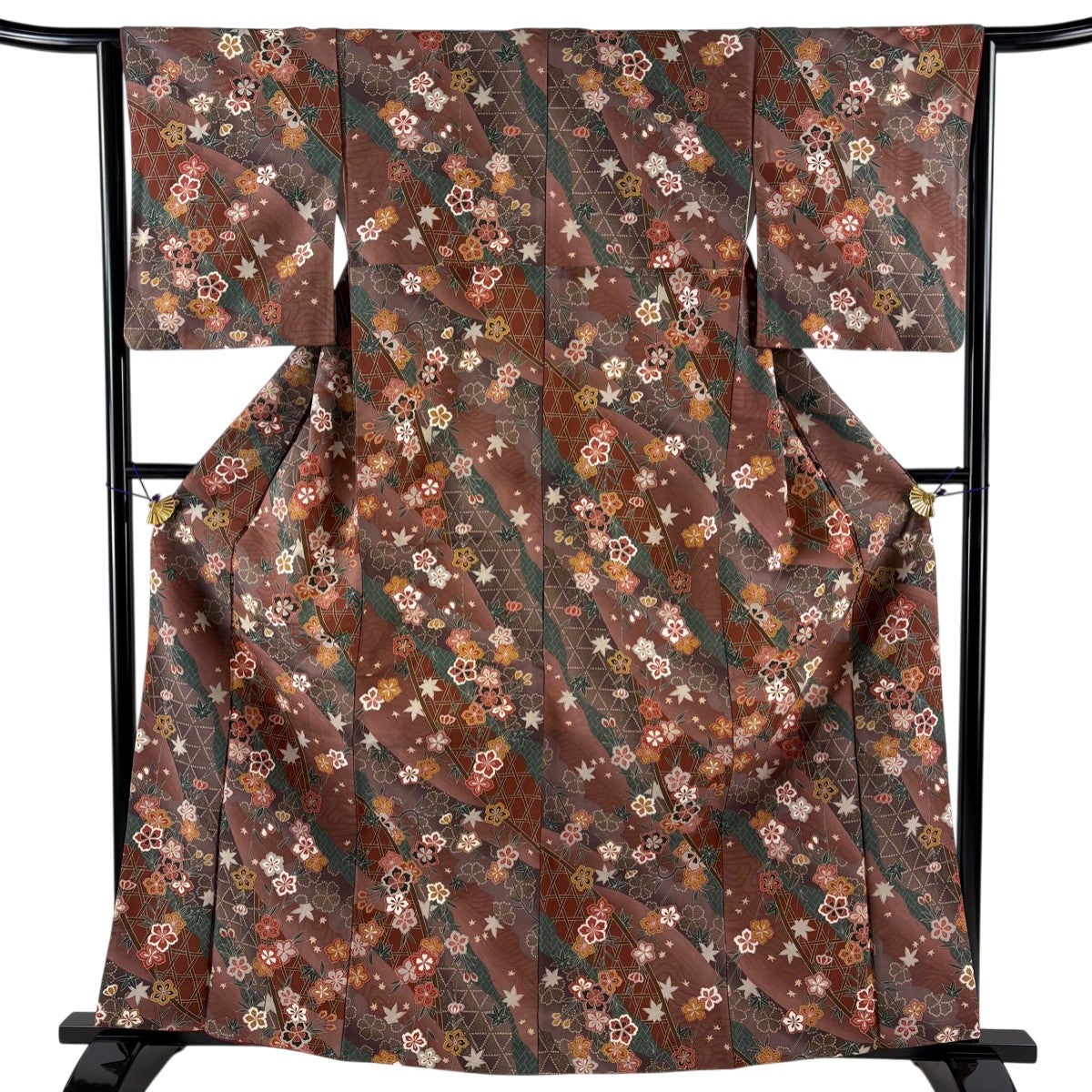 【美品】 小紋 身丈157cm 裄丈64cm M 単衣 草花 金通し 焦茶色 正絹 名品