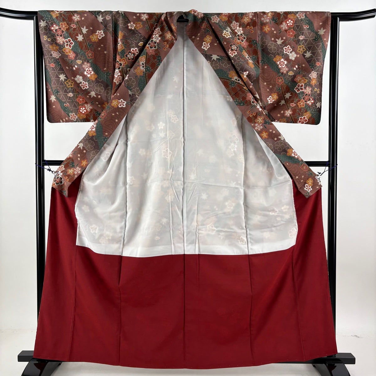 【美品】 付下げ 身丈162cm 裄丈62.5cm S 単衣 格子 幾何学模様 茶色 正絹 名品